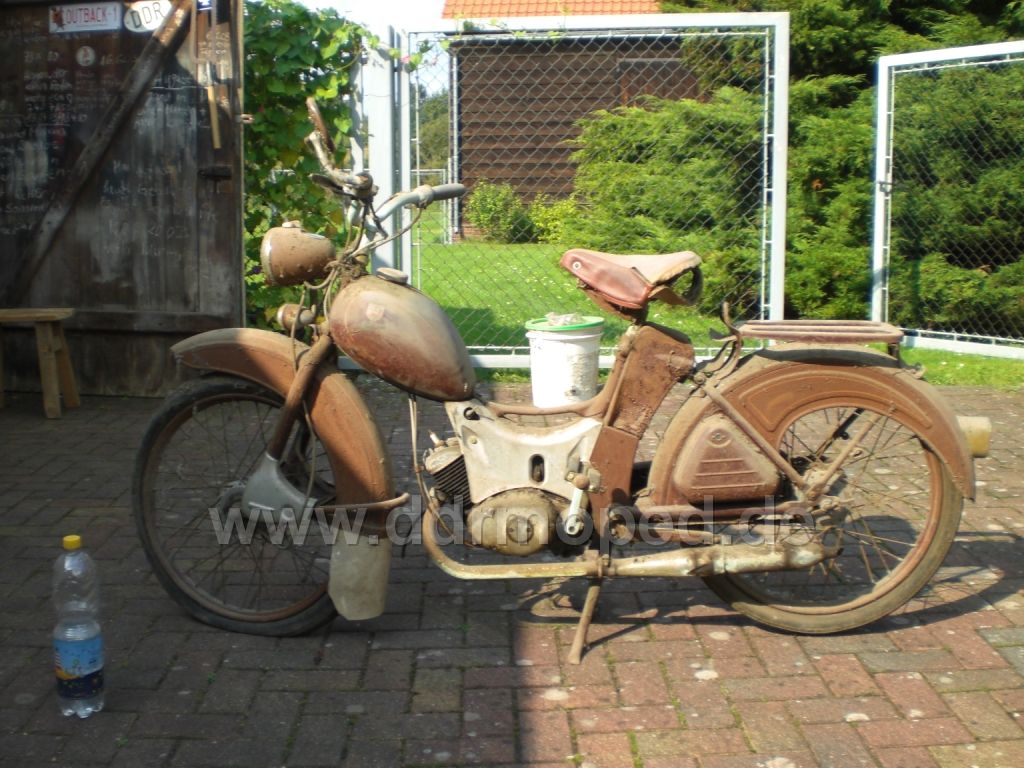 Hallo, mein Name ist Hagen. Ist irgendwie doof so mit der Tür ins Haus zu fallen deswegen fange ich erstmal an meinen SR2e vorzustellen. Während ich an meinem Erstprojekt (eine blaue KR51/1) herumgewerkelt hatte. Kam irgendwann (Schwieger-)Oma in die Gerage. (Wir wohnen auf einem alten Drei Seiten Hof) Folgender Dialog entwickelte sich: Oma: "Wat werkelst du denn immer an dem alten Ding rum. Du hast den ja so schön zerlegt das wir den ganz einfach in die Mülltonne kriegen." Ich: "Aha" O: "Dann kannste auch den anderen gleich mitzerlegen" I: "Watten fürn anderer? Ich hab doch schon überall nachgeschaut. Da is Nüscht" O: "[...] Na im alten Schweinestall, da steht noch son ollet Essipeng von Uroma rum." I: "Nicht dein Ernst" Also nachgeschaut, und ja: Eingemauert im alten Schweinestall stand ein SR2e. Die gemauerte Tür sollte mir noch Probleme bereiten allerdings verdanke ich diesem Umstand das das Ding noch da stand. Vor einer Woche habe ich den dan rausbekommen und das ganze Ausmaß gesehen. Rost. Dennoch mir juckt es in den Fingern was daran zu machen. Aber erstmal Bilders:
