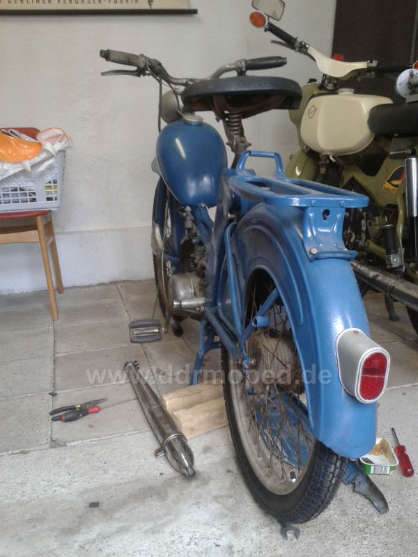 Übrigens war er original in dem Beige lackiert. An einigen Stellen sieht man noch Lackreste. Das Blau stammt aus einer Spraydose. habe ich gemacht, da er soweiso schlecht blau lackiert war, und sehr verrostet ist. Ein Aufbau dauert aber noch ein paar Jahre, ehe ich mein Studium fertig habe.. Mein nächstes Problem betrifft den Auspuff: Es ist der kurze Krümmer mit dem langen Topf. Aber irgendwie passt da was nicht