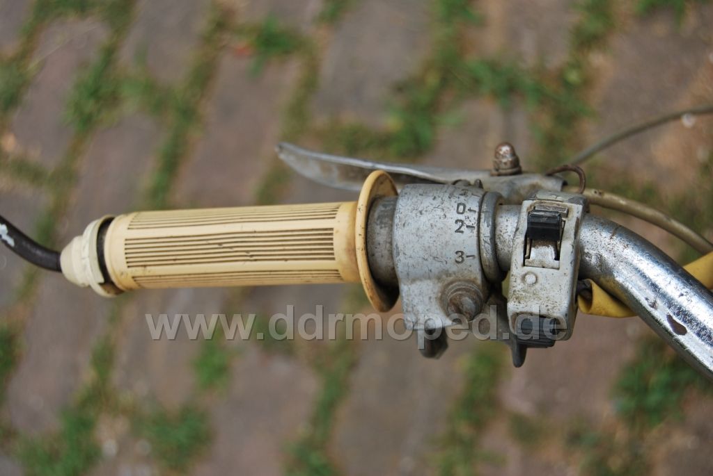 Der Besitzer wird sich der Blicke der ostzonalen Mopedfahrer sicher gewesen sein, irgendwann mal in Ermangelung originaler Ersatzteile einen Zylinderkopf, hintere Stoßdämpfer und Rücklicht vom Spatz verbaut haben und das Moped irgendwann nach völliger Verschlissenheit abgestellt haben, bis ich es fand.