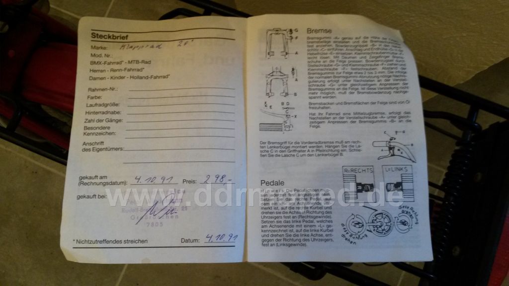 Imposant ist der Neupreis, wo man den Ostmarkpreis hier nahezu 1:1 in DM umgemünzt hatte. Der offizielle DM-Preis (GENEX) war vor 1990 ja deutlich niedriger als der Ostmarkpreis. Im Oktober 1991 hatte sich dann offensichtlich doch noch ein Käufer für 298 DM gefunden...