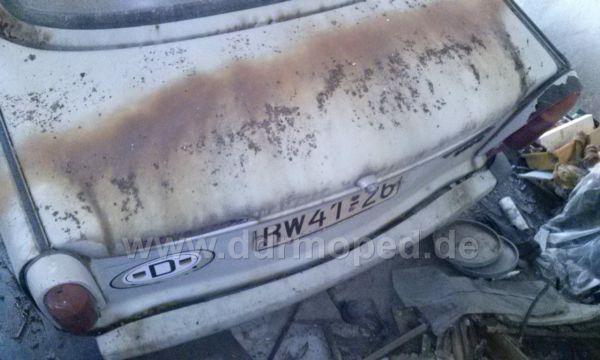 Ja , wie geschrieben , sind es nur die ersten Schnappschüße , die ich auf die Schnelle gemacht habe . Ich wollte ja die Garage und nicht den Trabbi. Ich habe die Garage von einer Frau gekauft , deren Mann im März verstorben ist . Sie sagte mir nur , das da aber noch ein Trabant drinnesteht. Der wurde noch kurz vor der Wende gekauft und solange es ging mit DDR-Nummernschild gefahren , dann abgemeldet und weggestellt . Und dann leider vergessen , sag ich jetzt mal . Denn ich kenne die Leute nur mit VW Golf . Es darf gerne weiter spekuliert werden , was fehlt , welches Bj und dergleichen . Ich mache wie geschrieben morgen nochmal bessere Bilder , nur soviel vorne weg , es ist eine LIMO mit AHK und aufgebockt, was vllt . die hängenden Räder erklärt . Ich habe noch auf die Schnelle gesehn , das da auf den Felgen Alu- oder Chromdeckel drauf waren , also nicht nur die blanken Radschrauben mit Gummikappe , wie bei späten Modellen. Kann aber selber von dem Mann getauscht worden sein .