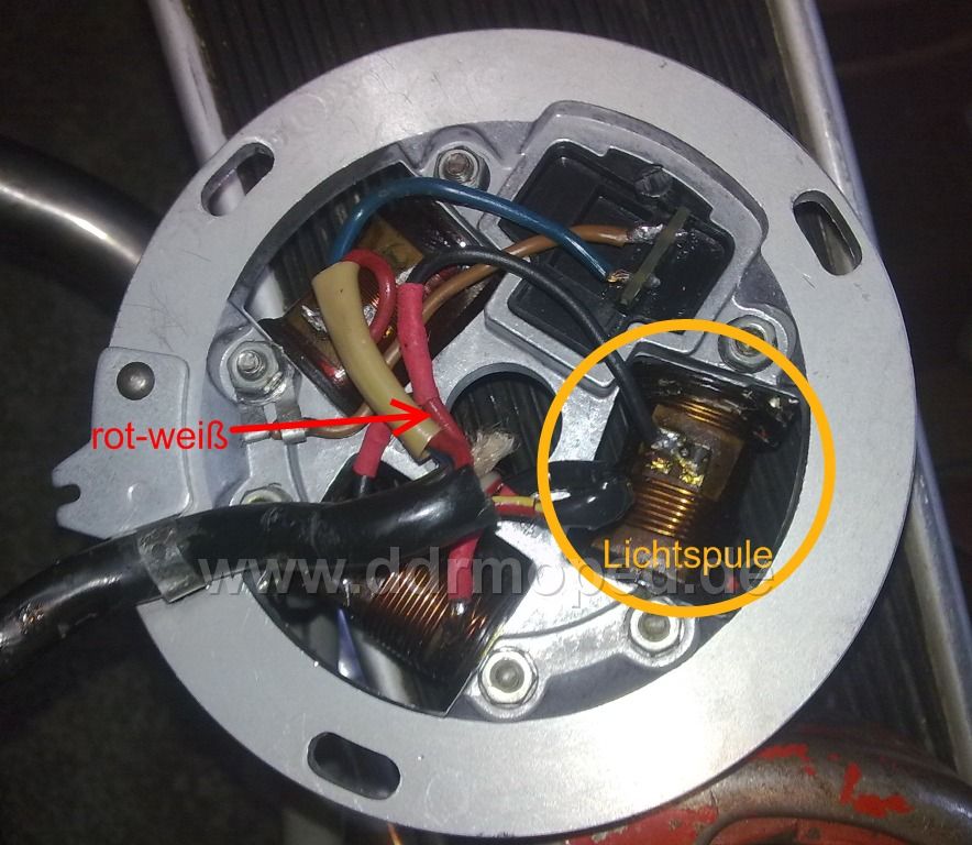 siehe Schaltplan für deine Simme. Die alte Lichtspule kannst du nun also abschrauben, wahrscheinlich musst du auch das Kabel von einem Lötpunkt ablöten, vielleicht ist aber auch eine Steckverbindung dran, das wirst du ja dann sehen.