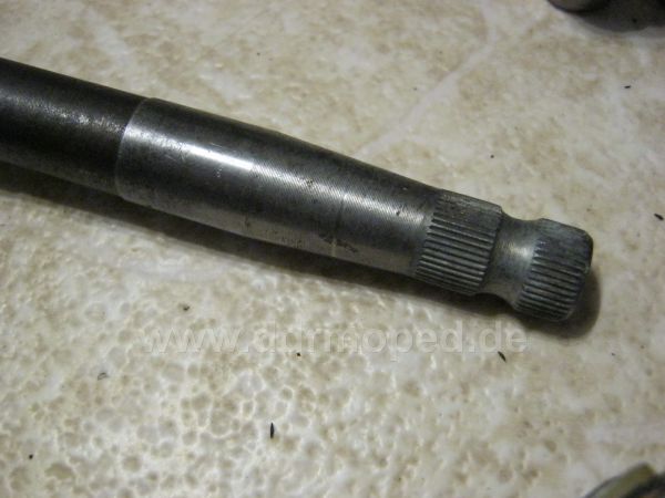 Nach langem überlegen und Hin und Her habe ich mich dazu entschieden dann den Motor doch mal auf zu machen (geplant war das anfangs nicht). Ich habe schon einige M500 Motoren regeneriert und einen M53 vom S50, aber noch NIE einen M53 Handschalter....... gesagt -> getan...... und da kam mir dann alles zum Vorschein. - Zylinder im Nullmaß aber extrem ausgewaschen und viele Riefen (und einem Kolben den ich noch nie gesehen habe vorher, dazu gibts auch noch ein Bild) - keine Anlaufscheiben oben verbaut - Kurbelwelle extremes Spiel vom Pleul - Motormitteldichtung aus einem selber nach geschnittenem Stück Bucheinschlagepapier oder was auch immer (das wurde wohl verbaut wo die grobe Kickstarterwelle getauscht wurde) - wohl noch alles die ersten Kugellager verbaut (4TKF) - Simmerringe hart wie ein Koffergriff (Marke "Kautasit) - Kickstarterfeder total vergniedelt - Getriebezahnräder und Kupplungswelle teilweise stark beschädigt