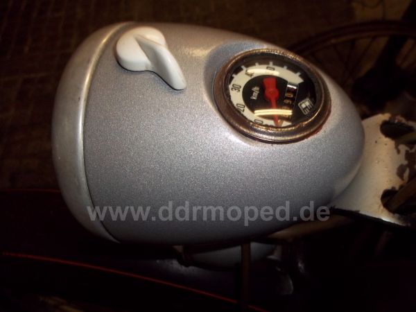Mein Name ist Frederic, ich komme aus Limbach-Oberfrohna, 41 Jahre jung und lese schon geraume Weile hier im Forum mit. Da ich jetzt selbst 2 Essis habe, dachte ich mir, eine Anmeldung kann nicht schaden. Zur Zeit richte ich eine 61er Essi wieder her, aber ich fand den Lack erhaltenswert und lasse das Teil in Patina. Ein Kollege von mir möchte es haben und so richte ich es für ihn wieder her. Ich bin leider etwas schusselig und habe keine Vorher-Bilder gemacht. Nun bin ich fast fertig, am Dienstag kommen die Armaturen vom Eloxieren wieder. Es fehlt lediglich noch ein Rohrständer und ein funktionsfähiger Tacho-Antrieb für 10er Achse. Alles andere ist vorhanden und muss nur noch eingebaut werden. Lediglich die Lampe und der Spiegel wurden in einer Art Hammerschlaglack Silber neu lackiert, Spiegelarm und Armaturen wurden Glasperlengestrahlt und Eloxiert. Die Teile wären sonst echt nicht mehr zu retten gewesen. Nun erst mal ein Bild von der 61er.