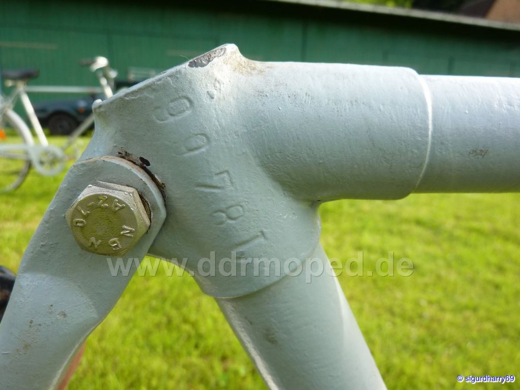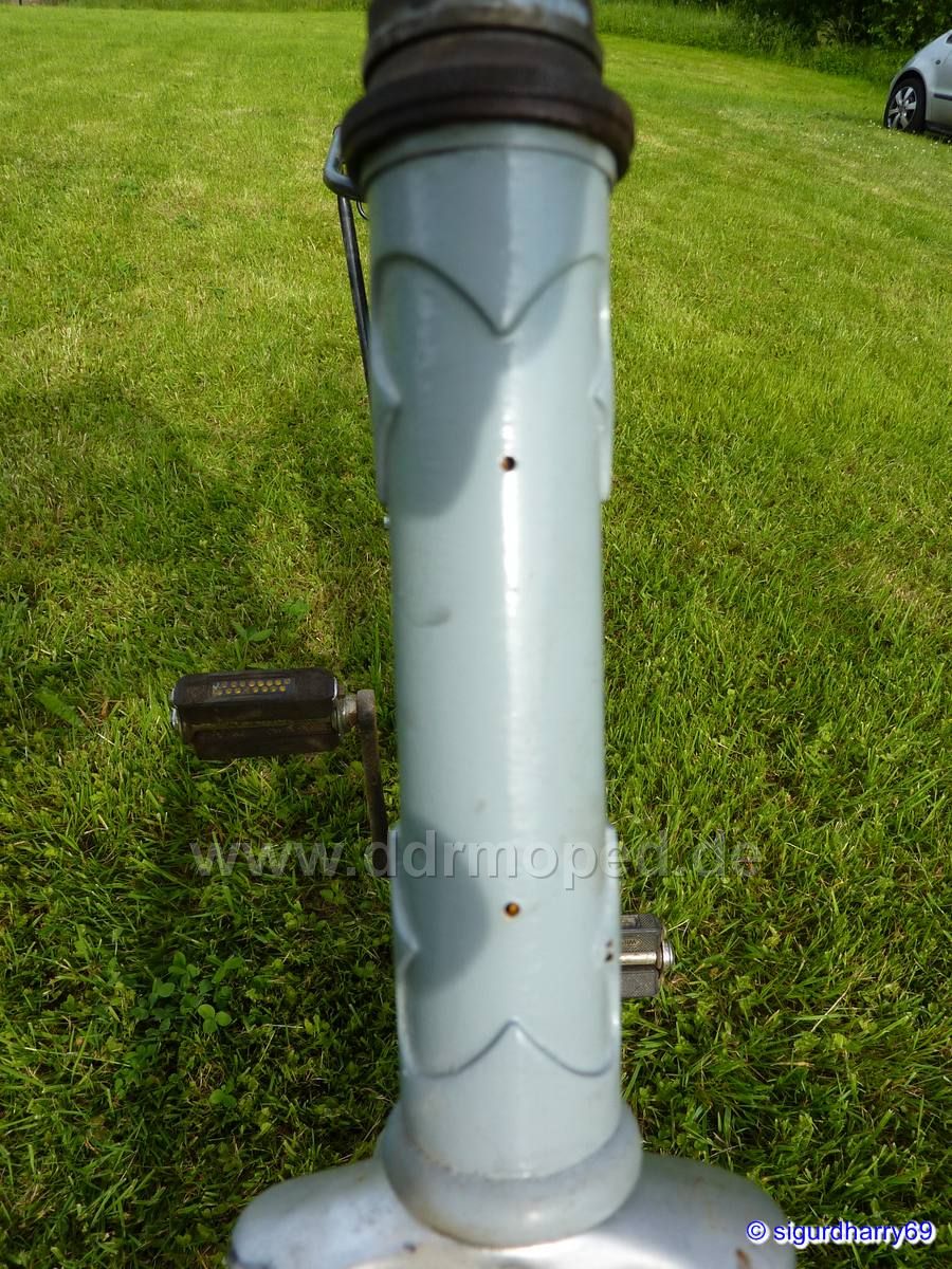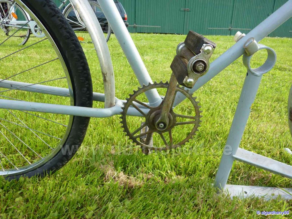 Auffällig sind die schönen Rahmenmuffen und das die Hintere Rahmenstrebe auch getauscht werden könnte. Ich schätze mal es ist aus der Zeit zwischen 1930 und 50 hergestellt worden, Es besitzt auch ein Loch für den Bandfeststeller der leider fehlt. Die Schutzbleche müßten auch sehr alt sein und aus dem Grund stelle ich mir vor das es eher Anfang der 1930 Jahre hergestellt wurde, da das hintere Schutzblech nicht sehr weit unterhalb des Rahmen nach unten geht. Der Rückstrahler ist auch sehr schön und sehr gut erhalten.