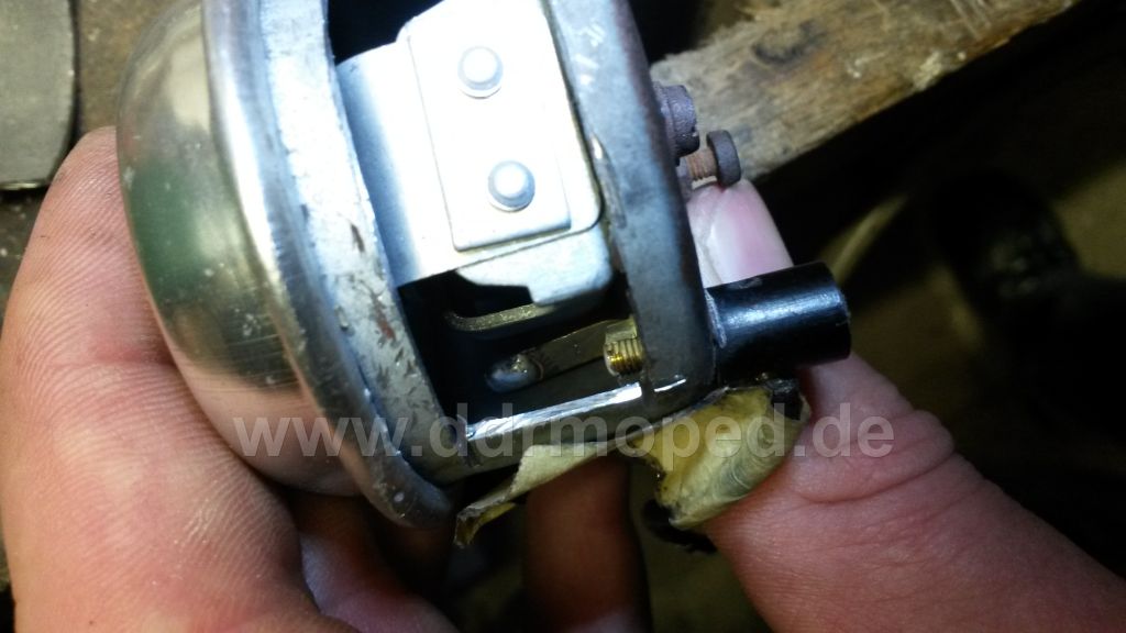 Im Netz hab ich was davon gelesen, dass die innenliegenden Kontakte korridiert sein könnten. Also haben wir die Hupe seitlich aufgeschnitten. Kontakte waren in Ordnung.