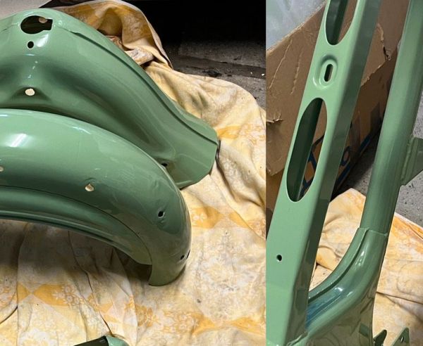 Ja genau wird es damals auch nicht gewesen sein. Aber das ist ja nochmal ein anderes Thema. Ich habe mal ein paar Leute bei Kleinanzeigen gefragt. Aber die meisten wissen nicht mal welchen Farbton sie gepulvert bekommen haben. Ansonsten wird fast immer RAL 1015 für den Tank etc. genommen. Eine Person hat das Ganze in RAL6011 gepulvert. Anbei mal ein Beispiel. Falls doch mal jemand auf dieses Thema stößt. Das ist natürlich niemals der Originalton, aber könnte dennoch ganz stimmig wirken.
