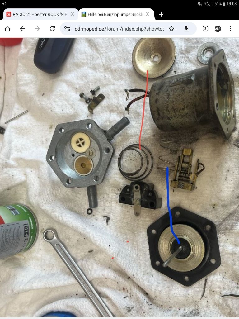 Keine Ahnung. Aber: https://www.ebay.de/itm/282810512160?_skw=s...ABk9SR7yunua7ZgGibt es noch zu kaufen. Hole dir so ein Ding. Zerleg es und schau wie es aufgebaut ist und was dir fehlt. Kannst du ja dann wieder montieren und zurück schicken. Oder du fragst bei dem Anbieter "Sirokko Dienst" mal ob er UNterlagen hat und dir helfen würde. Zitat aus dem Angebot: "Es sind auch alle Ersatzteile einzeln verfügbar, womit jede vorhandene Pumpe wieder repariert werden kann siehe andere Artikel. Auf Wunsch wird zur Pumpe per Email (leistungsfähiges Postfach erforderlich) die Bedienungsanleitung mit Aufbau und Rep. Hinweisen bereitgestellt. Die Pumpen sind auch als 6V und 24V verfügbar einfach anfragen."