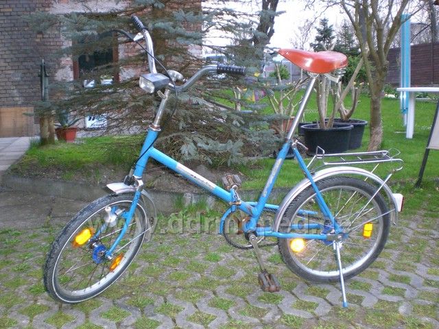 Toni, warum haste nicht vorher mal was gesagt? Ich habe vor ca. nem Monat mein blaues Klapprad mit vielen Teilen weggegeben. Schönes Klapprad haste, aber die Reflektoren in den Speichen bitte noch abmachen, denn die gabs zu DDR Zeiten nicht. Vorne noch nen schöner Reifen druff und dann eventuell mal nach Aufklebern Ausschau halten. Da bin ich dran. Kannst dich ja mal melden.... Ne weiße Lampe und grauer Bowdenzug würde bestimmt auch schnuffelig aussehen  ... mfG Christoph
