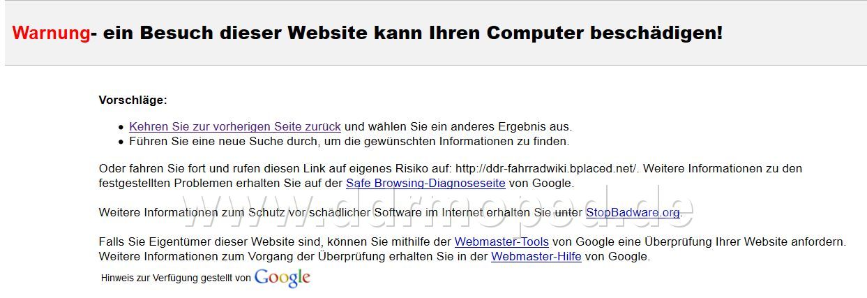 Beim Seitenaufruf kommt: Warning: Cannot modify header information - headers already sent by (output started at /users/ddr-fahrradwiki/www/index.php:1) in /users/ddr-fahrradwiki/www/includes/WebResponse.php on line 16 Und der Virenscanner spricht: 23.09.2012 14:21:12 Verboten: http://mineraledrink.pl/img/count.htm (mit der Datenbank für verdächtige Webadressen untersuchen) http://mineraledrink.pl/img/count.htm Der Link wurde in einer Datenbank gefunden Internet Explorer