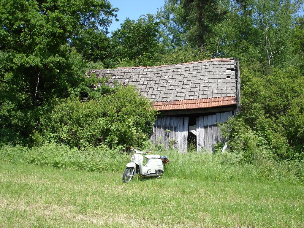 Dieser Schuppen/diese Scheune wurde wahrscheinlich das letzte mal vor 50 Jahren gebraucht, da es von keiner Seite eine erkennbare Zufahrt gab. Irgendwo im Niemandsland an einer Schonung total verwuchert. Ich musste hunderte meter übern Acker fahren, damit ich an die noch sichtbare Seite gelangte.