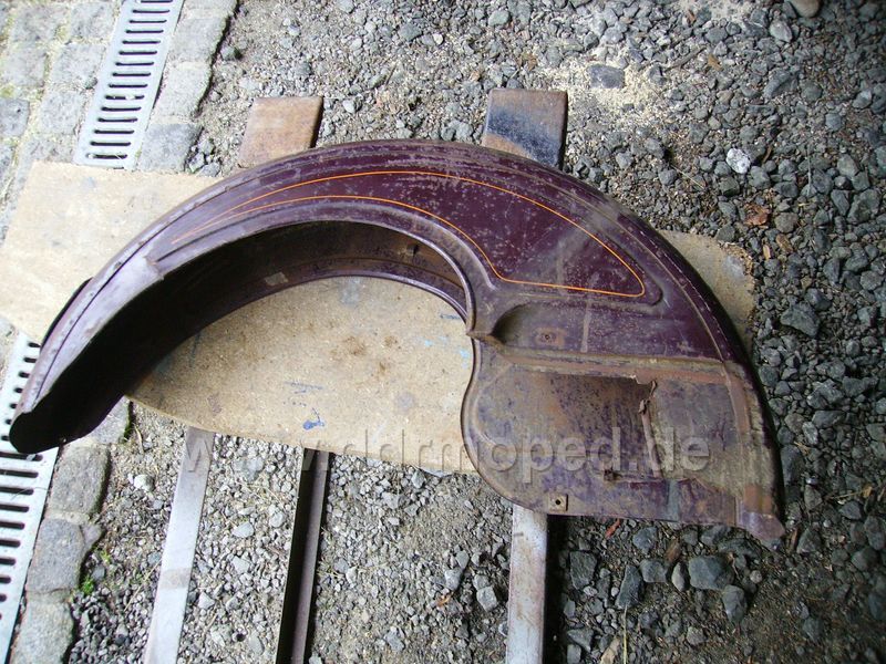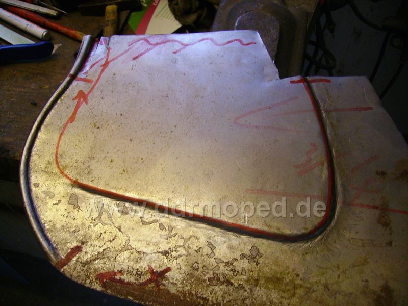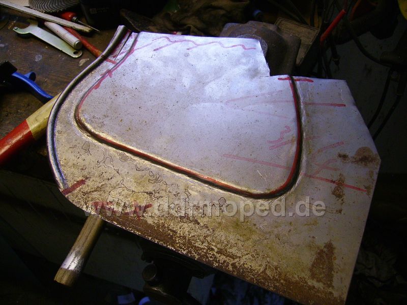 Die Lösung des Problems klingt eigentlich simpel, ist sie aber nicht. Die Öffnung am Schutzblech wird mittels eines passenden Blechteils zugesetzt, so dass die gleiche Kontur wie auf der Gegenseite entsteht. So weit - so gut, aber optisch gesehen ist dies nur die halbe Wahrheit. Um ein ansprechendes Ergebnis zu ereichen, muß dieses Teil natürlich auch die passende Sickung bekommen. Also wiedermal echte Handarbeit, denn eine passende Matrize, geschweige denn eine Maschine hab ich dafür nicht. Hier der Anfang, die Außensicke ist mittlerweile schon drin. Jetzt muß nur noch die genaue Form und Lage der Innensicke festgelegt werden und dann sehen wir weiter...