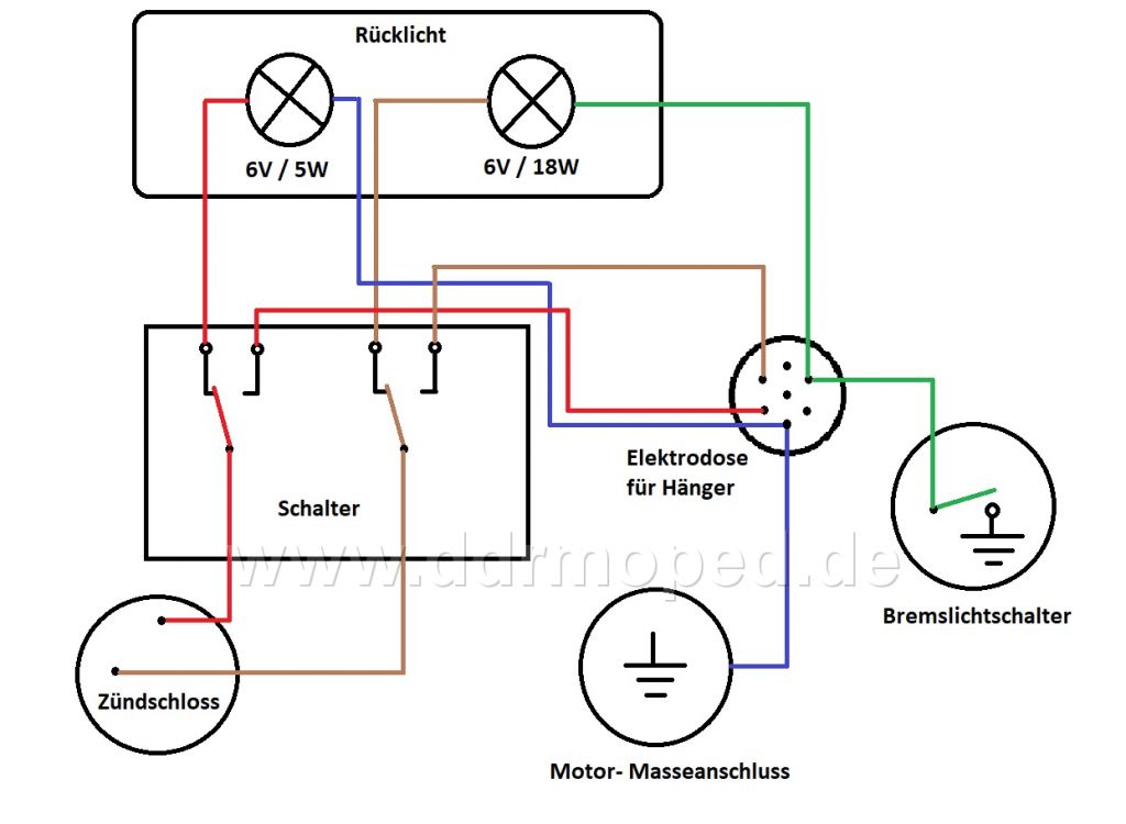 Ich bin gerade am Überlegen meine Elektrik vom Star- Rücklicht um zu bauen. Die Abklemmdosen für den Mopedhänger sind echt für den Dauerbetrieb zum kotzen und ich muss ständig ohne Rücklicht fahren, weil das Bimetall ständig an Druckkraft nach lässt. Ich würde lieber einen Wechselschalter für 2 unabhängige Phasen einbauen. Sprich 2x Eingang 4x Ausgang. Weiß wer, wo man sowas in Kompakten Stiel her bekommt? (Der Masseanschluss in der Grafik ist Eigenbau, da es an der üblichen Stelle nur Problem mit der Masse gab.  )
