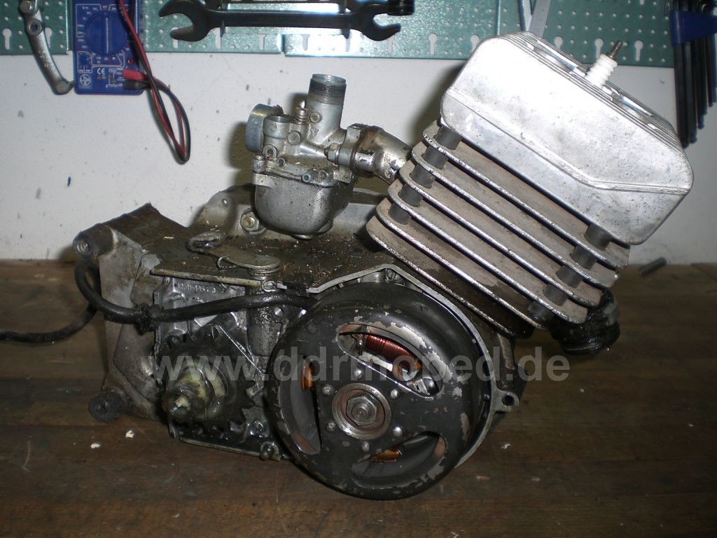 Also Motor raus,neuen Motor aus'n Regal geholt und rein damit.Dann gleich 'ne neue Zündung,DDR Auspuff und 16N1 eingebaut und schon lief der Hobel wieder.