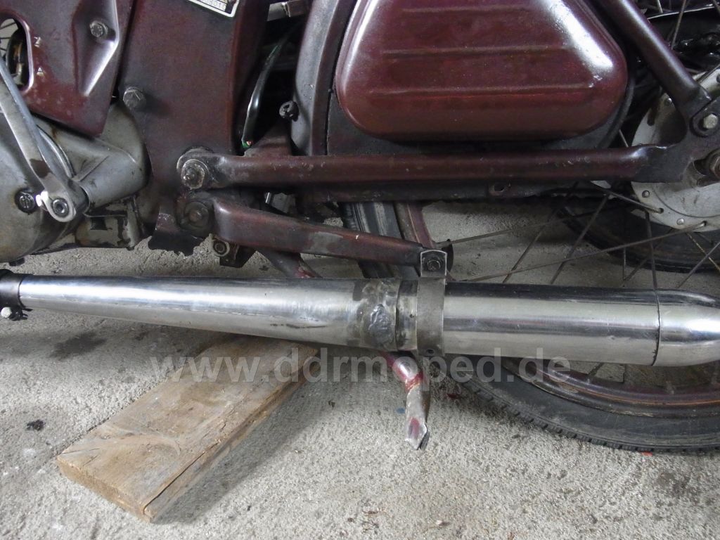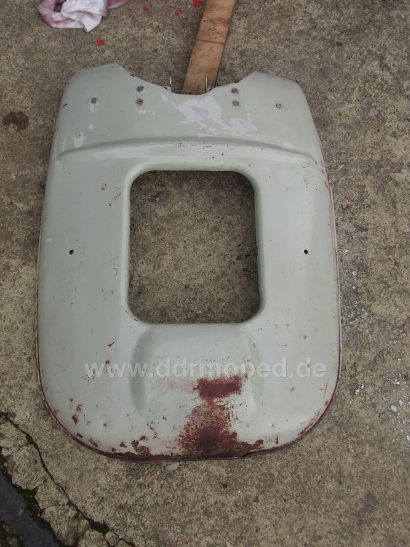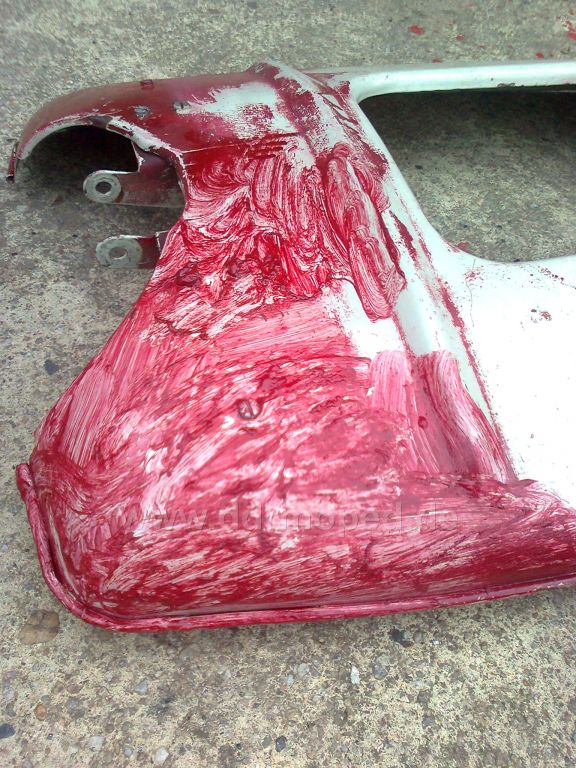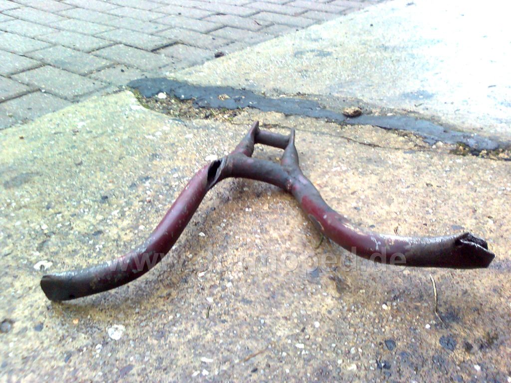 So, Endprodukt des heutigen Tages... Oben die weißen Flecken... Wäre interessant ob das Knieblech noch mal komplett gemacht werden muss oder ob es sich eher um Grundierung handelt... Achja, und grade gebogen hab ich es noch... wenn die eine Halterung wieder nachgeschweißt ist kanns an den S50 habe fertig^^