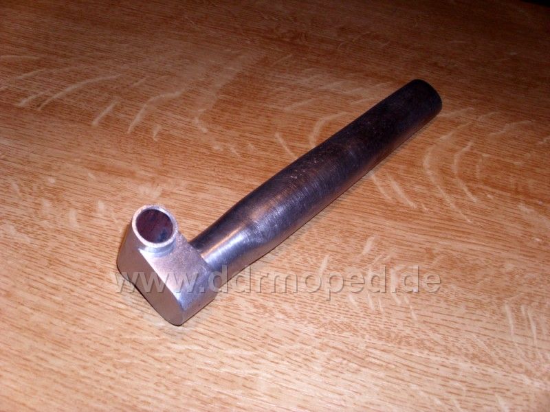 Das Schwierigste an der Sache ist die ovale Form des Rohres, da es keine flachen Seiten besitzt (so als wenn man es einfach Flachdrücke/-schlagen würde). Dazu dann noch das Gelenkstück (welches im Original ein Gußteil ist) aus nem passenden Rohr und einem Blechstreifen geformt und verschweißt. Das Ganze dann noch bissl mit Schleifer und Feile betun und in Form bringen.