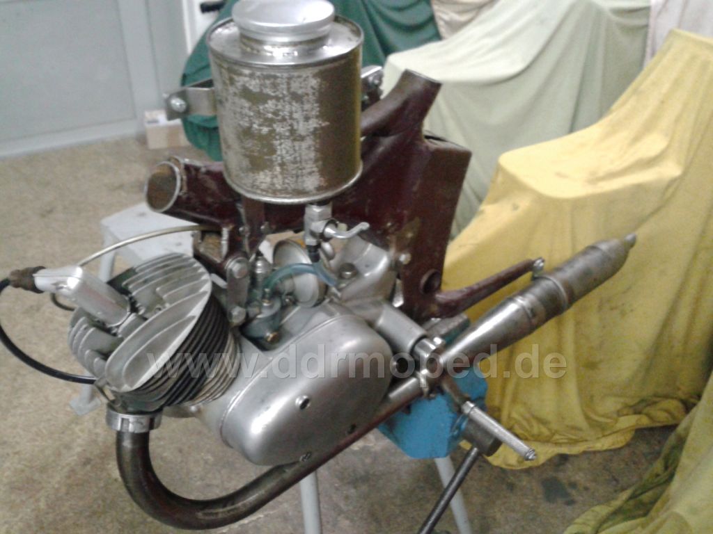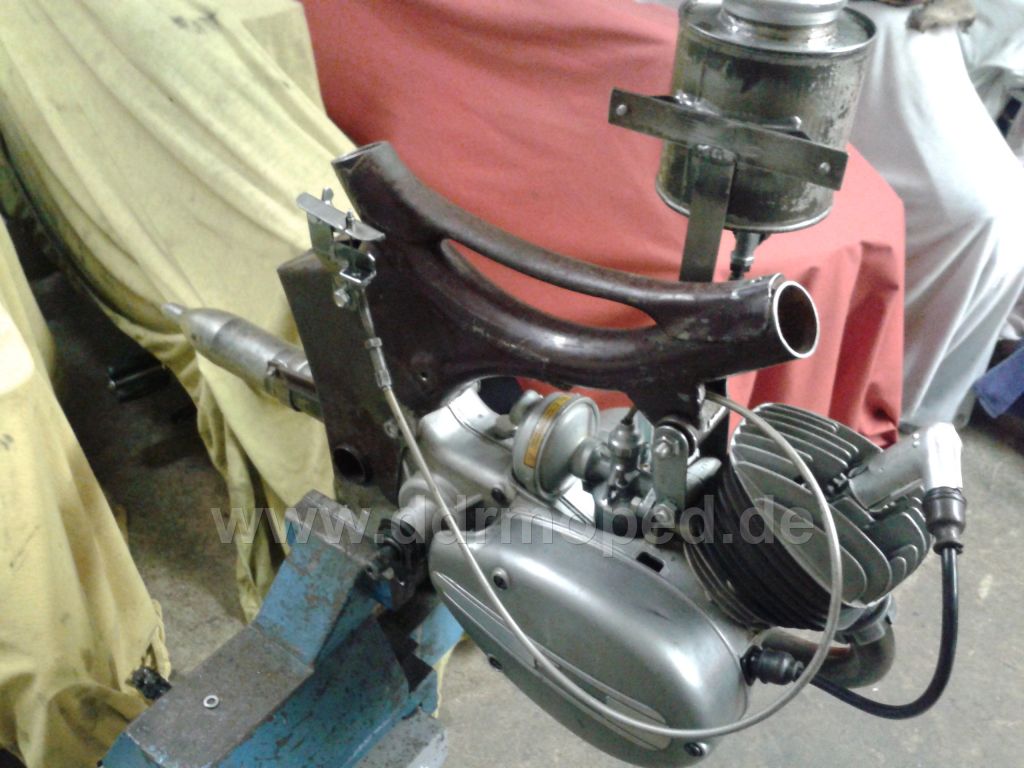 ein Moped . Ihn einfach so im Stand laufen zu lassen, bringt null Nährwert . Es darf dabei die Kühlung nicht ausser Acht gelassen werden . So müsste ein Kettentrieb und Hinterrad auf eine Rolle gesetzt werden, welche dann einen Widerstand darstellt . Dann muss auch das Getriebe geschaltet werden und es werden Leistungswerte abverlangt .