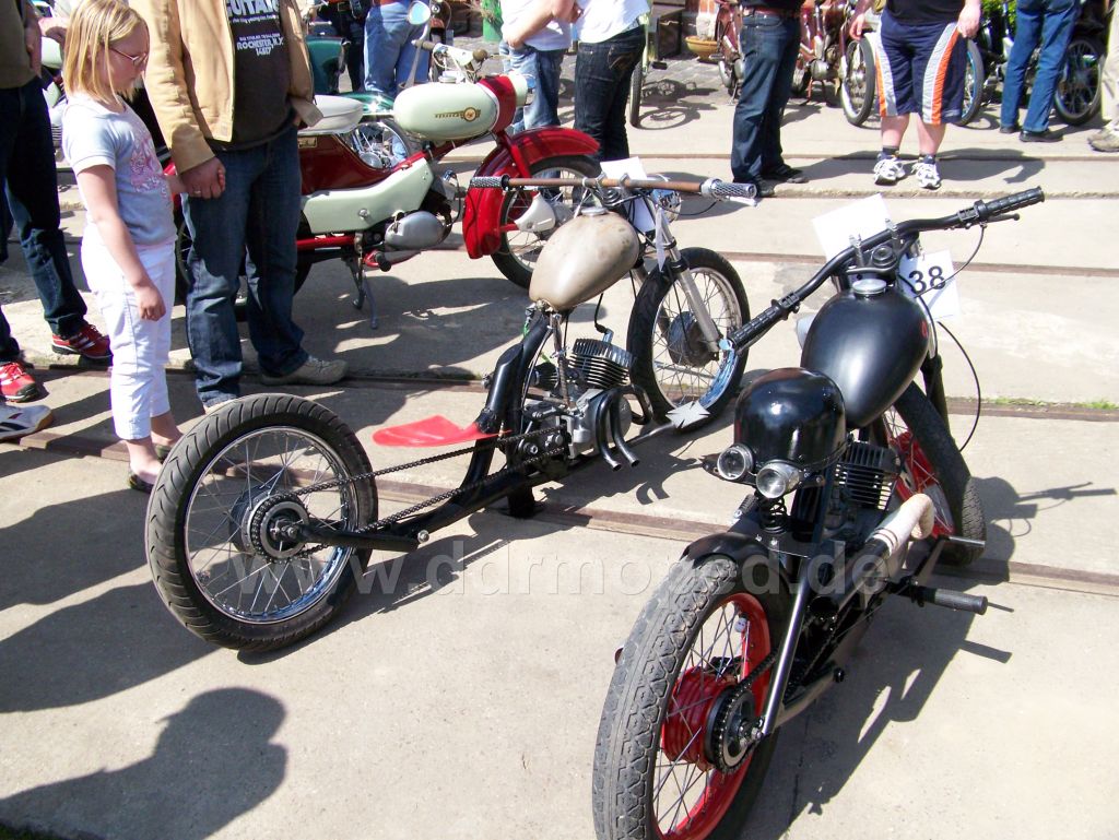 wie ich oben schon schrieb... Wir kommen aus der Nähe von Borna bei Leipzig, haben es also nicht all zu weit. Trotzdem werden wir wohl ein Weilchen unterwegs sein...  Die, auf den zwei Fotos abgebildeten Moppeds sind leider nicht unsere. An mich gerichtete Fragen oder Kommentare, zu Lackierung, Liniengestaltung, Zustand usw. sind also zwecklos... Ich hoffe, wir sehen uns dann am 9. Mai in Meuselwitz bei Roster und Bier...