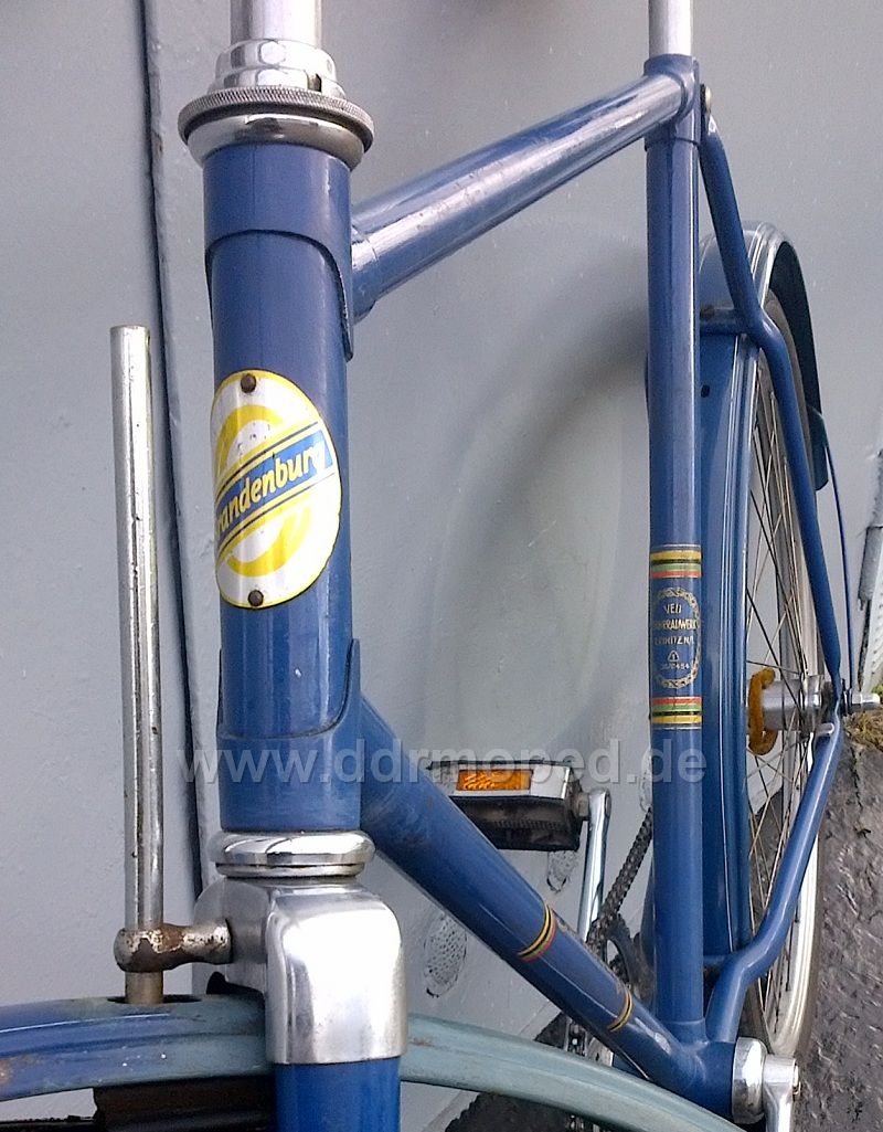 Hallo Günter, laut "Markenware Fahrrad" von Frank Papperitz gehört das Steuerkopfschild zu den Brandenburger Konfektionsfahrrädern. ("Die große Anzahl von verschiedenen Brandenburg-Typenschildern ohne Herstelleraufschrift macht deutlich, dass es sich bei den meisten Rädern um Konfektionsware handelt." S.72, 2.Auflage 2008) Die Fahrräder aus Bielefeld hatten das gleiche Schild - nur war ein B unter dem Brandenburger Tor drauf oder es stand H.&W.S.B. ganz oben (wohl für Hildebrand und Wolfmüller?). Nicht vergessen darf man, dass in den 30er Jahren jedes fünfte Fahrrad aus Bielefeld kam, so auch Zulieferteile.