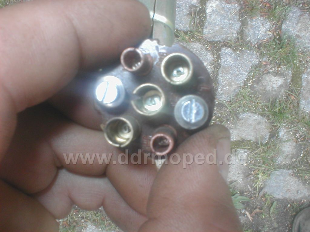 Zum Schluss werden die Leitungen am Stecker angeschlossen. Auf den Teil, wo die Leitungen verschraubt werden, befinden sich genau die gleichen Bezeichungen, wie bei der Steckdose. Diese gleichen Bezeichnungen habe auch den Kontakt zu seinen Zwilling in der Dose. Also wird so verbunden... Leitung 5B mit Kontakt 54L (Rücklicht) Leitung 34 mit Kontakt 54 (Bremslichtschalter) Leitung M mit Kontakt 58R (Masse) Leitung 54 mit Kontakt 54R, bzw. steht da nur ein R ( Bremslicht) Dann könnnt ihr alles schließen und befestigen und dann funktioniert alles so, wie es sein muss. Funktioniert das Rücklicht nicht, obwohl ihr den Stecker aus der Dose gezogen habt, so haben die Metallblättchen in der Dose keinen ordenlichen Kontakt, oder werden verbogen, weil beim festschrauben in der Dose irgendwelche Leitungen die Bleche zerdrückt werden.