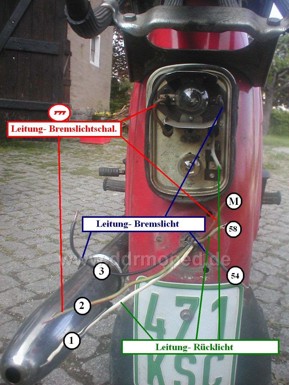 Diese 3 Leitungen führt man dann direkt zur Steckdose. Vom Rücklicht aus führt man ebenfalls 3 Extraleitungen zur Steckdose. 1, 2 und 3 sind die 3 Leitungen, die man im obrigen Beitrag sehen kann. M, 58 und 54 sind die Leitungen, die vom Rücklicht kommen.