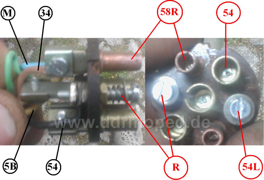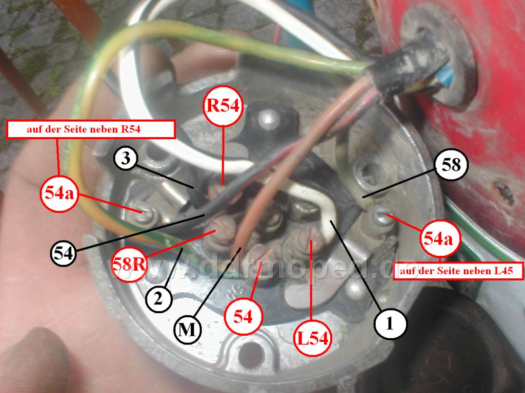 So werden jetzt die Leitungen in die Dose verschraubt! Leitung 58 wird in Kontakt 54a , das sich neben Konakt L54 befindet, geschraubt. Leitung 1 wird in Kontakt L54 geschraubt. (Diese beiden Kontakte sind durch die Biegefeder verbunden und versorgt beim Kontakt das Rücklicht am Star) Leitung 54 wird in Kontakt 54a , das sich neben Konakt R54 befindet, geschraubt. Leitung 3 wird in Kontakt R54 geschraubt. (Diese beiden Kontakte sind durch die Biegefeder verbunden und versorgt beim Kontakt das Bremslicht am Star) Leitung M und Leitung 2 werden gemeinsam in Kontakt 54 geschraubt. In Kontakt 58R habe ich dann eine Leitung verschraubt, die ich dann mit den hinteren Kotflügel masse geschlossen haben, weil das S50 Rücklicht keine Masse zum Hänger besitzt und ich eh 2 Phasen in der ganzen Leitung vom Hänger über habe. (hier auf den Foto noch nicht Installiert)