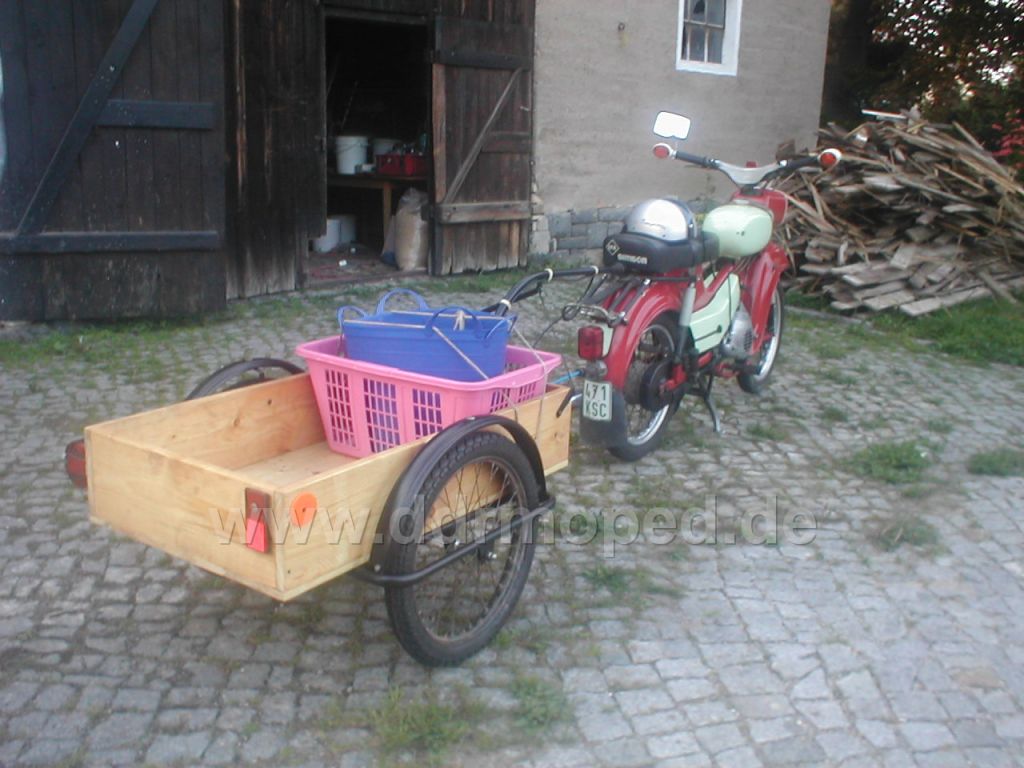 Hy Fleppus, danke für das Lob..ich bin der letzte, der Sagt, geht nicht, ab in ne Müll. @ Sperberhaftes Natürlich mit einer orginalen DDR- Hängerkupplung, es gehen aber auch die Nachbauten bei Exxy, die sind aber nur aus Normaleisen, nicht so hart im Metall, wie die Orginalen. Nico241090, bei mir zählt jeder Cent schwer und die Wühlkisten müssen auch mal irgendwann lehr werden.....hast schon recht Heute habe ich alles fertig zusammengebaut. Leider gab es keine runden roten Rückstrahler hier bei den Händlern, aber die werden noch nachgerüstet. Die Schutzbleche werden solange benutzt, bis die ein Sicherheitsriseko werden, oder nicht mehr ihre Funktion erfüllen. Sonst ist der Hänger fertig und hier noch die letzten 4 Bilder....