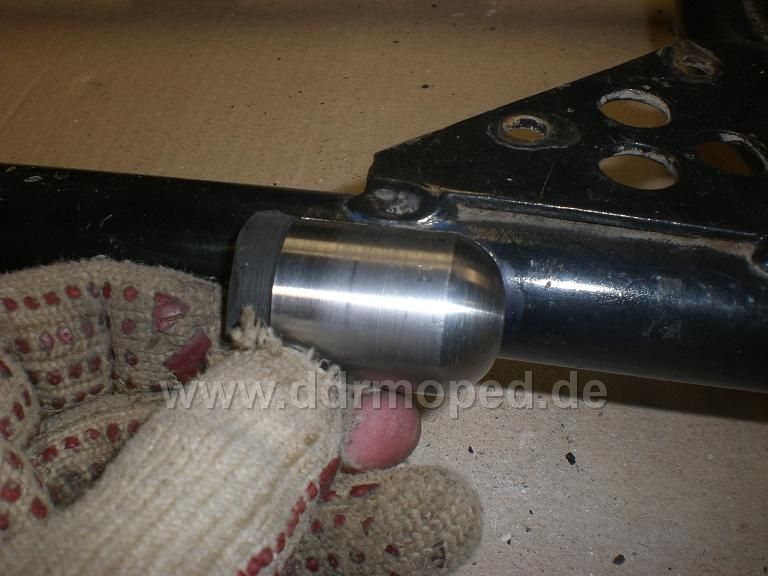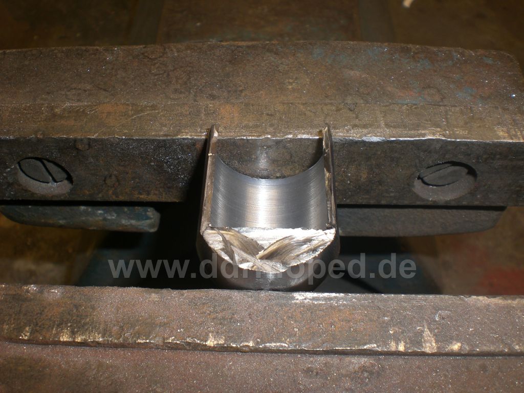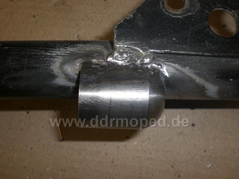 Gestern Abend war wieder Teamwork mit Rudi angesagt aber zunächst habe ich erst einmal die Hülse fertig gemacht. Erst wurde die mit der Halbrundfeile schwer bearbeitet und dann angeschweißt. An der Naht kann man unschwer erkennen, dass sich der Awo Rahmen sch..... schweißen läßt aber es hält und den Rest hat mein Dremel erledigt
