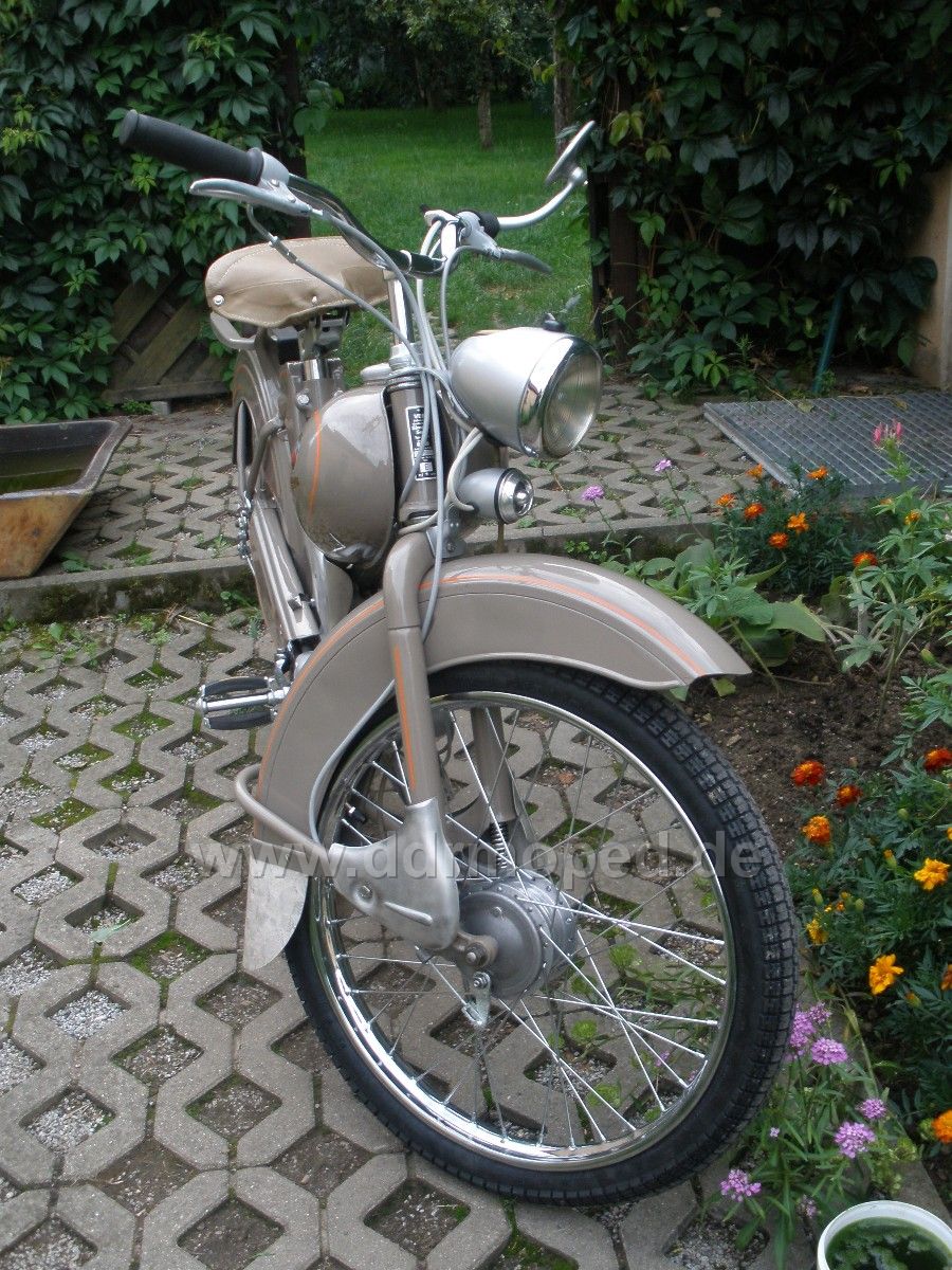 Könnt ihr euch noch an den erinnern? Als ich mein MAW-bestücktes Brandenburg-Fahrrad abholte, sollten mein Junior und ich diesen 63er zu neuem Leben erwecken. Ziel war nicht unbedingt baujahrskonformität, viel mehr sollte aus dem vorhandenen ein ordentliches fahrtüchtiges Fahrzeug entstehen, mit dem man sich auch auf die Straße trauen kann. Und das ist das Ergebnis. Nicht unbedingt etwas für die absoluten "Originalos", aber im großen und ganzen wurden Originalteile verwendet (die Pedalen und die Auspuffanlage hat der "Auftraggeber" besorgt). von vorn: