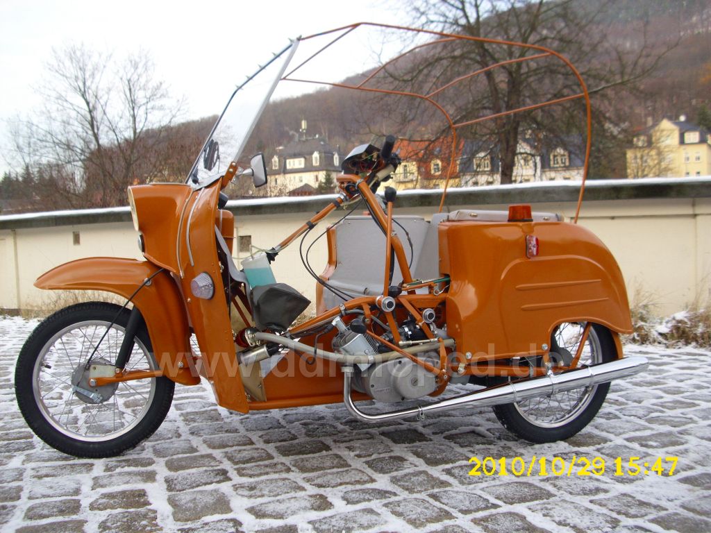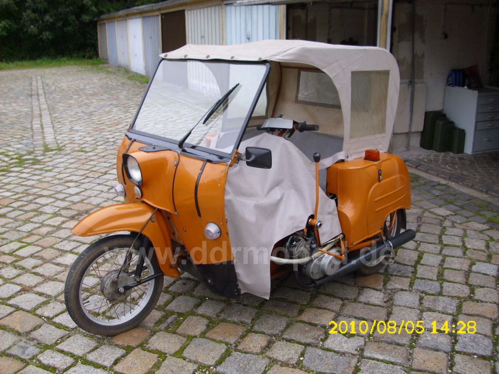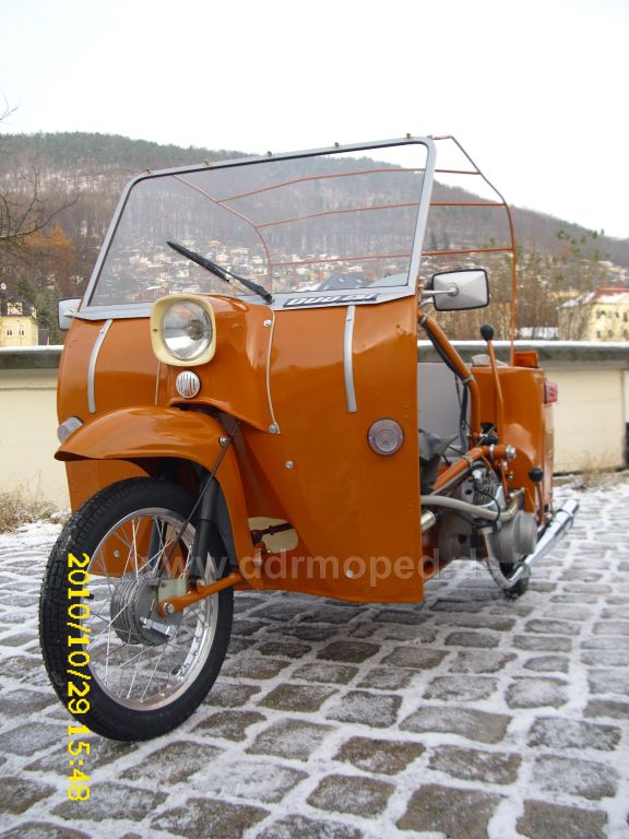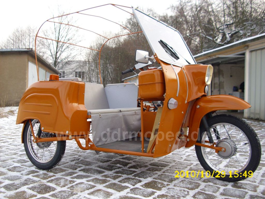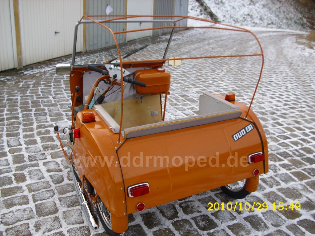 Es ist vollbracht !!!! Mein Duo wurde heute gegen 15:00 mit der Hartwachskur engültig fertig,nach nun fast 4 Montaten überholung,also zerlegen,sondieren u. ersetzen von Fehlteilen,und wo ich am meisten stolz darauf bin-der reparatur des schönen Originallackes! Wie ich finde,ist mir das sehr gut gelungen,war auch sehr gewagt,den ohne den tollen speziel für mich angemischten Sprühlack vom Doc hätte ich das niemals so geschafft!Ich betone noch einmal ausdrücklich,es ist KEINE komplette Neulackierung!!! Ich mach unten noch mal ein Vorherfoto dazu,da kann man den underschied erkennen.Gleichzeitig sieht mein Duo auch nicht zu neu aus,genau so sollte es auch sein,den ich mag etwas Kratzer u.Gebrauchsspuren,es hatt ja Geschichte hinter sich u.die soll man ihm auch ansehen können. Ich kann ja auch mal sagen,was ich ungefähr so noch reingestecken musste,was ich so hoch nun auch wieder nicht dachte,das beläuft sich auf ca.600,-€ ,damit sind die Kosten mit Kauf und Zubringung 1700,-€! Aber ich finde,das wars wert,das duo kann sich sehne lassen,ist konserviert und voll funktionstüchtig.Naja,fast zumindestens,den leider liess sich der Motor noch nicht starten,Funke ist kräftig da und Benzinweg stimmt alles,aber ich war alleine,da konnte ich es nicht anschieben,das wird dann sicherlich damit klappen,u wenn nicht,gibts halt das Forum als hilfe hier!  Beim aufziehen der Dachplane ist die Naht von den Seitenscheiben gerissen,habe auch schon den Fehler erkannt,habe da was mit dem Dachgestell nicht ganz richtig gemacht,wird korrigiert u. genäht. So,was gibts noch zu sagen,achso ja,ich werde noch in der Nähe des Tankes eine Halterung anbringen für zwei Krückstöcke u,einem Gehstock,als Gag sozusagen,und ich lass grad einen Scherzhaften Duo Aufkleber anfertigen,der hinter die Scheibe kommt. Dann freu ich mich wie immer auf Meinungen und Hinweise,es war mir ein Vergnügen,die Wiedergeburt meine Duo 4/1 Bj.86 hier bei DDRMoped zeigen zu dürfen!!! es grüsst der Enrico