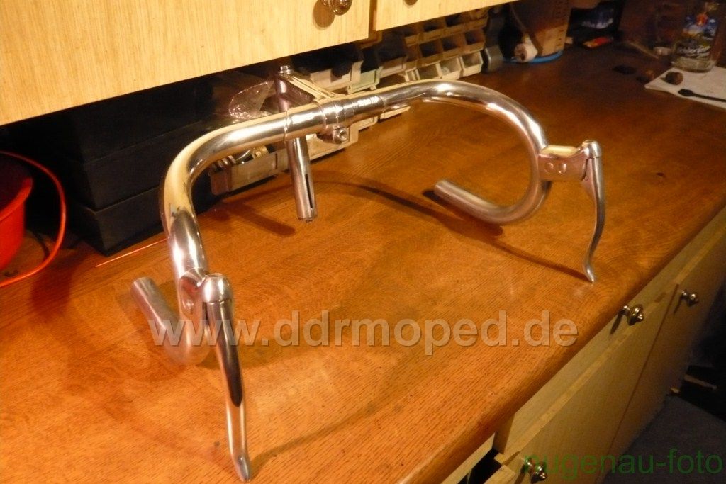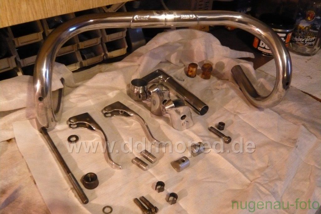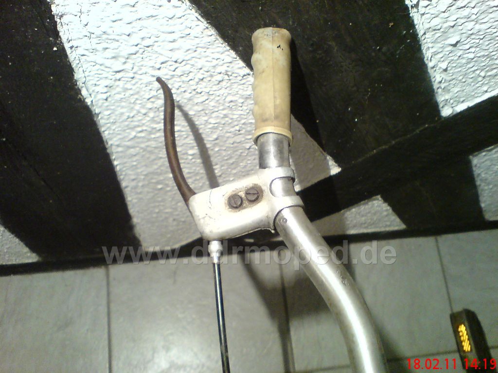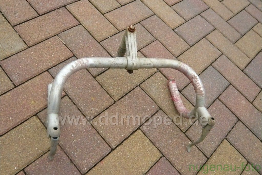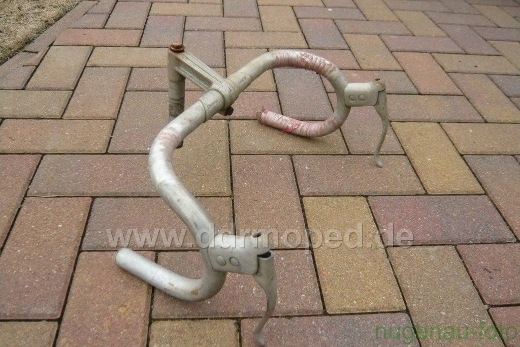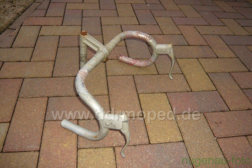 Wie es auf den ersten Blick ausschaut ist er nicht verbogen oder angebrochen. Genaueres werde ich sehen wenn ich den Lenker etwas aufpoliere. Die Bremshebel sind direkt am Lenker befestigt, also nicht mittels Schellen angeschraubt. Auch die Nippel für die Seilzüge sind im Innern der Hebel vorhanden!