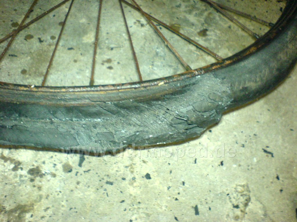 Schneide ein Stück raus so daß Du von innen ran kommst und dann mit nem kleinen Scharfen Meissel und nem Hämmerchen von der Felge holen. Hab ich auch mal so gemacht bei nem Rad. Da waren dieReifen auf die Felge aufgeklebt. Danach mit Schleifpapier nacharbeiten und der neue kann drauf.