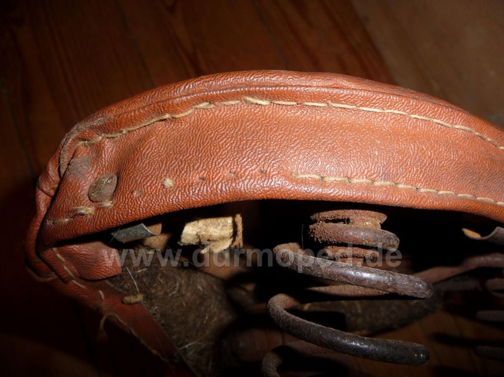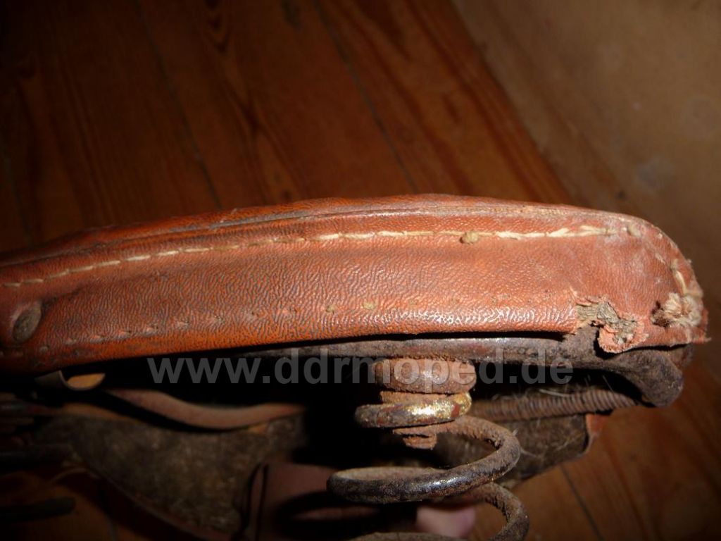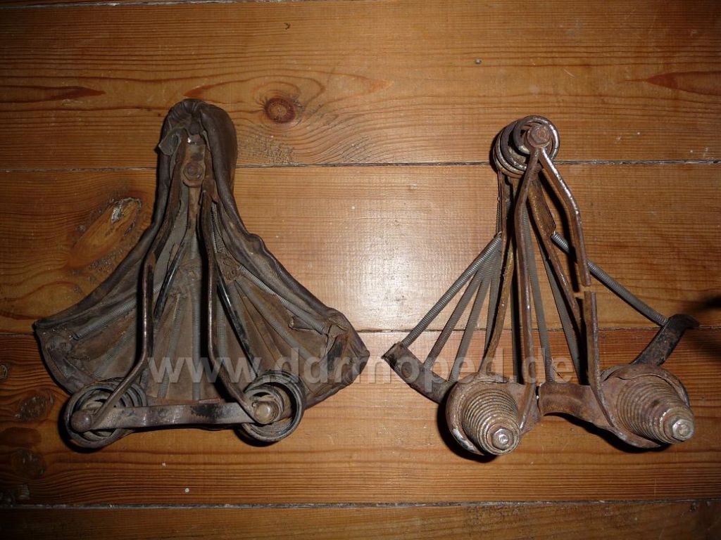 Ich hätte auch noch einen braunen Damensattel (50er/60er) und einen grauen Herrensattel (um 1970) anzubieten. Beide von Möve und aus Kunstleder. Gestelle rostig, müssten zudem sicher etwas nachgenäht werden. Damensattel 5 Euro, Herrensattel 10 Euro.