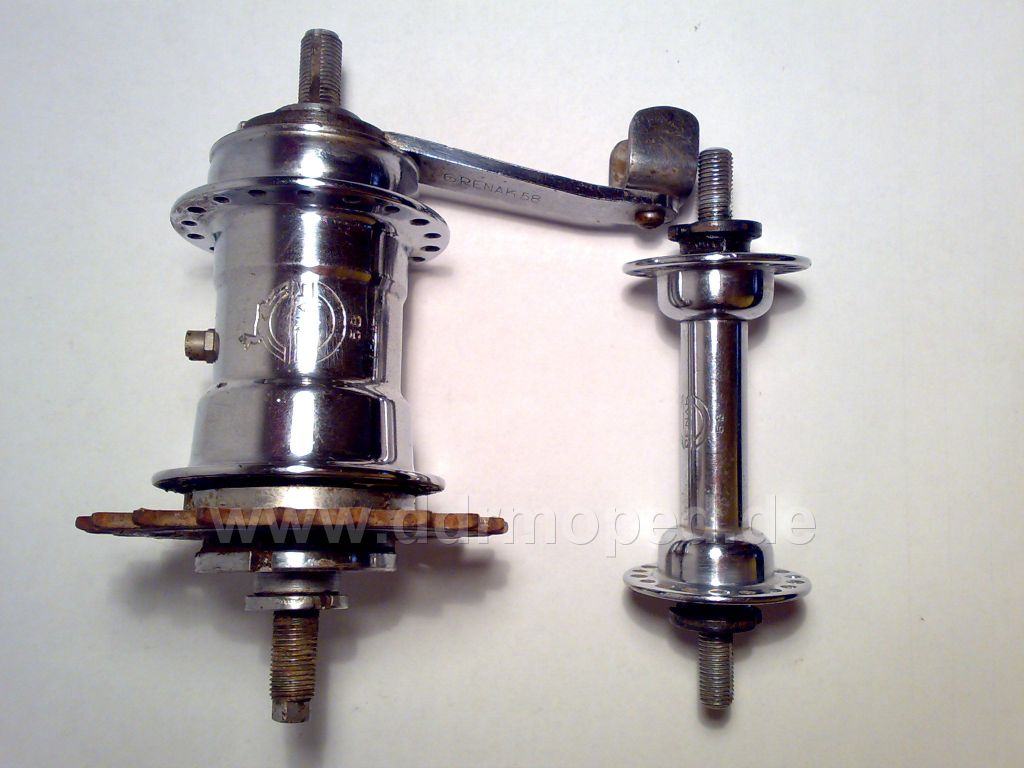 Ich habe noch ein 1958er Nabenset übrig; vielleicht baut ja gerade jemand das dazu passende Rad auf. Die Naben sind im Petroleum-Bad von grobem Schmutz und Fett befreit, aber noch nicht poliert. Die Lager sind durch das Bad natürlich trocken und müssten geöffnet, gereinigt und neu gefettet werden. Der Zustand der Chromteile ist gut (kleinere Rostpickelchen). Der Zahnkranz zeigt schon Verschleiß und sollte wahrscheinlich besser gewechselt werden. Hier gibt's noch ein paar mehr Bilder: http://img256.imageshack.us/g/191120101719.jpg/Preislich dachte ich an 20 EUR.