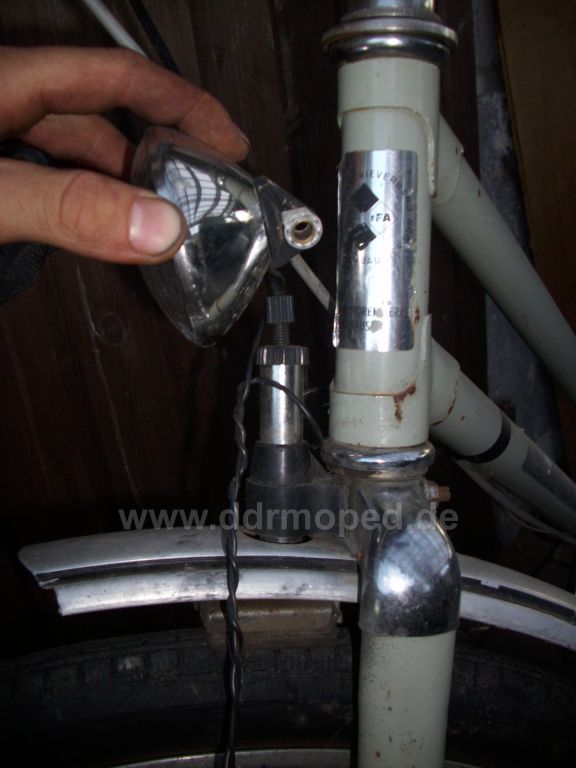 http://ddr-fahrradwiki.bplaced.net/images/...C3%BChrung1.jpgDas Gestell ist rostig, braucht also im Zweifelsfall etwas schwarzen Lack. Vorn ist in der Gummidecke ein kleiner Riss, den ich aber gern mit speziellem Gummikleber klebe. Die Decke hat einen schönen Braunton.