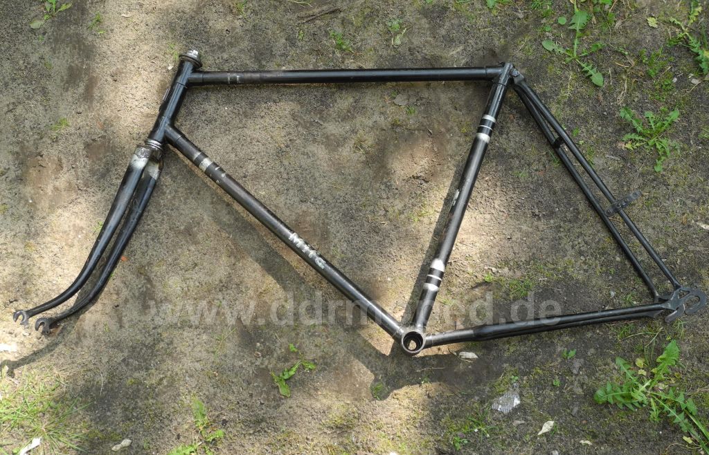 Da ich bereits ein 9 e habe, trenne ich mich schweren Herzens vom Rahmenset eines 1954er Modell 9 e in schwarz. Einige schöne Originalteile sind noch dabei, die im Fundzustand noch erhalten waren. Leider fehlen die Schutzbleche, an den noch vorhandenen Streben erkennt man, dass schwarz lackierte Stahlschutzbleche mal verbaut waren.