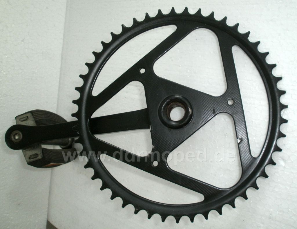 Hallo ! Ich habe hier eine Garnitur (Typ 8041-S)aus Kettenblatt und Tretkurbeln mit Pedalen. Das Kettenblatt und die Kurbeln habe ich mal pulverbeschichtet lassen, weil ich ein Projekt hatte mit einem komplett schwarzen Fahrrad.Die angeschraubten Pedale sind nicht DDR passen aber gut dazu.Das Kettenblatt und die Kurbeln haben Gebrauchspuren (siehe Fotos) war ich leider selber ...tut mir leid. Ingesamt aber alles ok. Preis inkl. Versand 30,-€ Grüße
