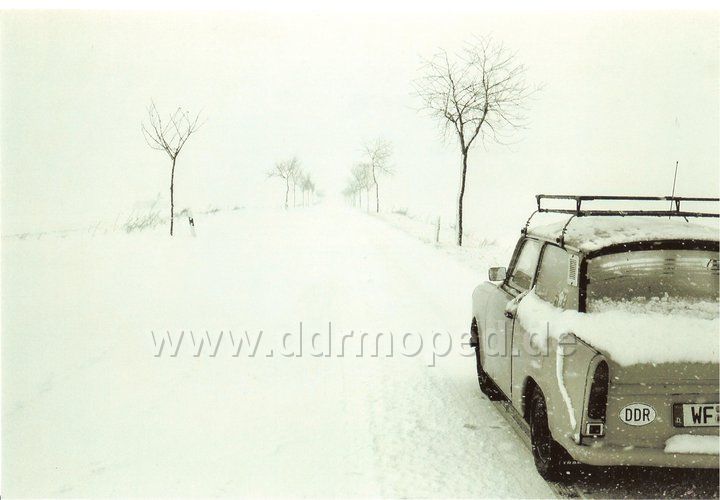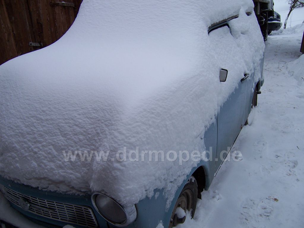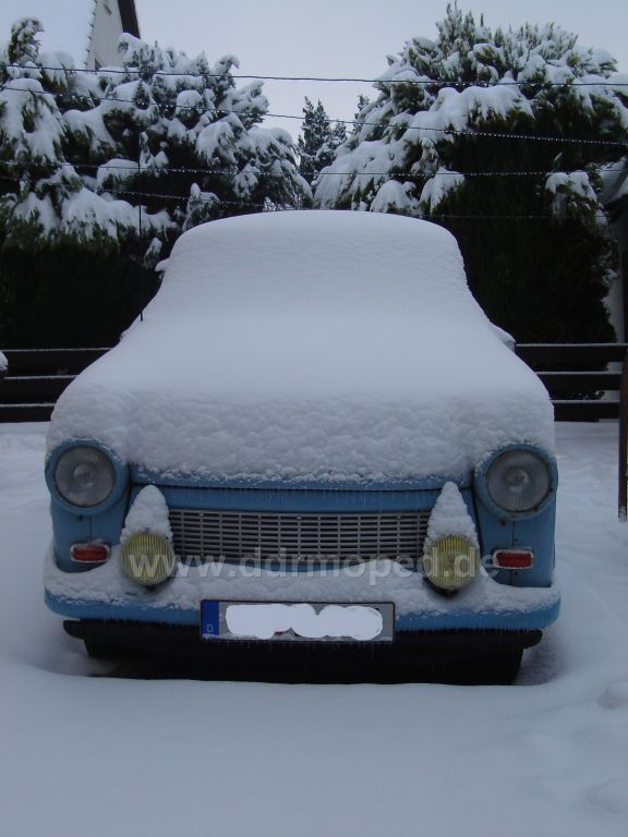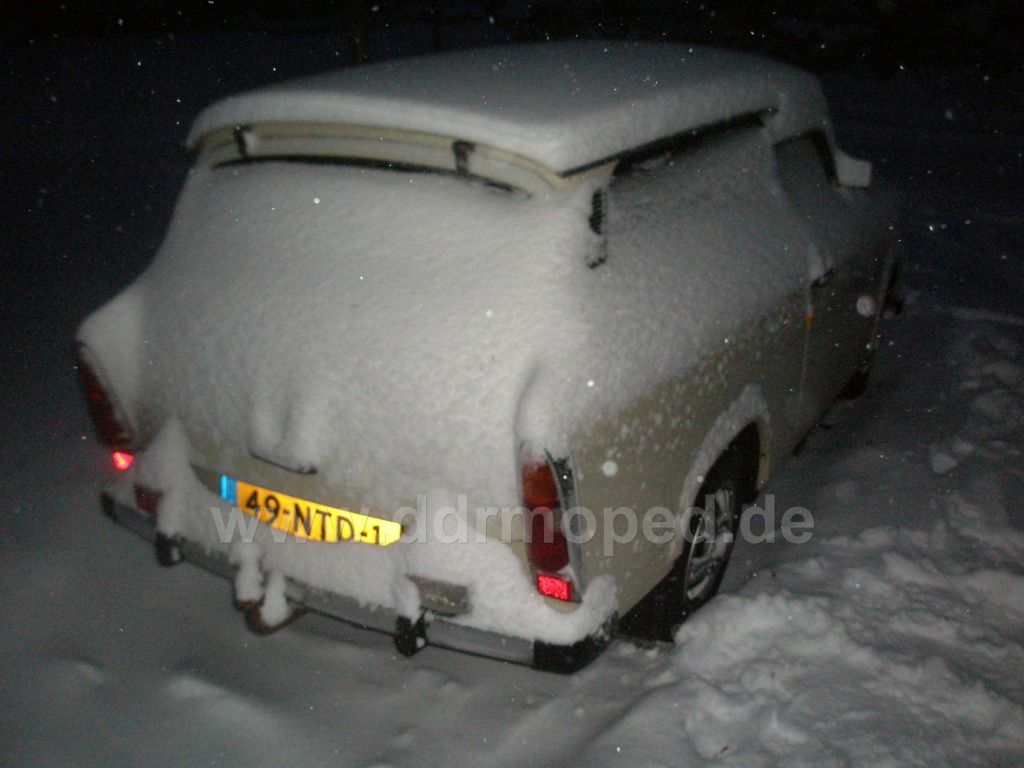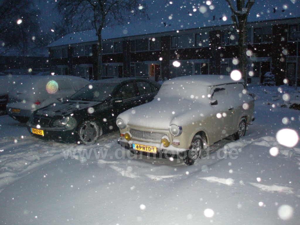 Letzte Woche hat es für Niederländische Verhältnisse stark geschneit. Ihr seit das natürlich viel mehr gewohnt wie wir. Hier fahren keine Busse mehr und auch nicht mehr alle Züge. Mit meinen Benz konnte ich trotz neue Winterreifen auch nicht viel anfangen. Mit ESP wurde alles so abgeriegelt das er gar nicht mehr gefahren ist und ohne ESP konnte er keine Haftung mehr finden, heckschleudern garantiert! Naja, dann eben den Trabant nehmen um nach meine Arbeit zu fahren