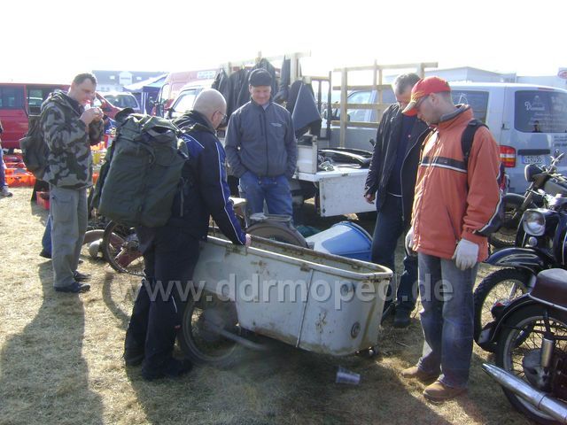 Ja, war wieder schön in O.-O., ergiebig und anstrengend, wie immer eigentlich. Die Saison hat begonnen. Getroffen haben wir basti1971, damaszenerschmied, Concorde und Mopedtobias, den lambiman mit neumi83, als er gerade den ergatterten 75-ziger Rahmen fortschleppte. Später ging noch die Kunde um, der König hätte die Droschke anspannen lassen und sei in Richtung des Schlachtfeldes gen Ottendorf aufgebrochen. Gesehen haben wir seine Majestät jedoch nicht leibhaftig. Es scheint Novellierungen seiner erlassenen Gesetze für das Reich zu geben, die Neuerungen wurden gleichwohl umgehend als Blechware von der Händlerschaft feilgeboten, um dem Moped-Volke diese auf geeignete Weise näherzubringen...