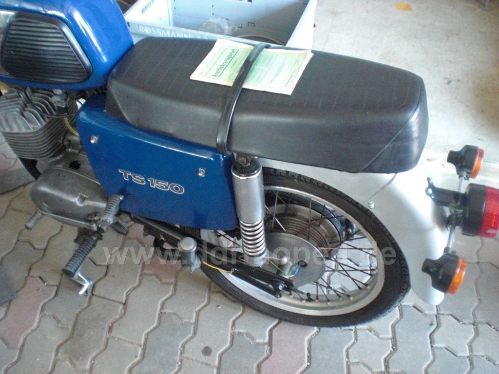 OK, die Aufkleber sind nachträglich draufgekommen. Die Neckermann-Ausführung der TS 150 hatte Rücklicht und Schutzblech-Endstück der ES 150 verbaut. Ja, es war original die 32mm-Gabel verbaut. Zum Zurückrüsten bräuchtest Du diese mitsamt Steuerkopf und Schutzblech. Aber wozu? Wie ich schon geschrieben habe, die 35mm-Gabel spricht im Fahrbetrieb besser an, lässt sich viel leichter warten und Ersatzteile gibts dafür noch massig. Schlag zu, viel zum Schrauben gibts allerdings an der Maschine scheinbar nicht  .
