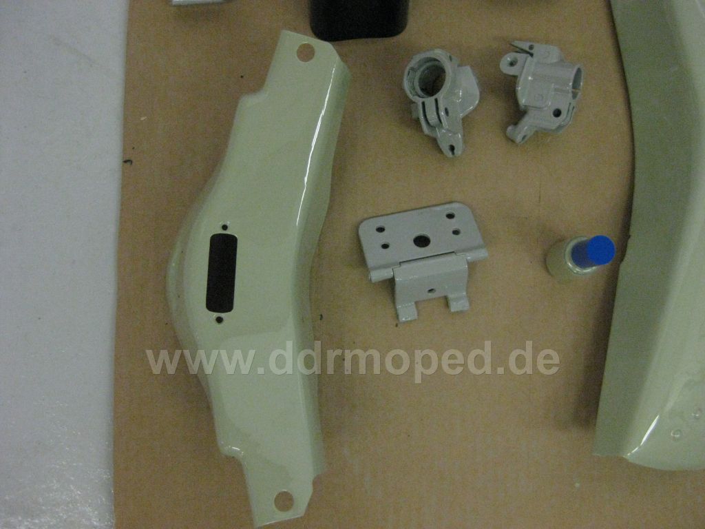 Die Scharniere sind entweder im Sitzbankblechgrau oder in dem grau wie der Lenker lackiert. Du kannst aber alle Teile auch einheitlich Lenkerarmaturengrau machen, wenn die die einzelen Farben zu sehr verwirren.