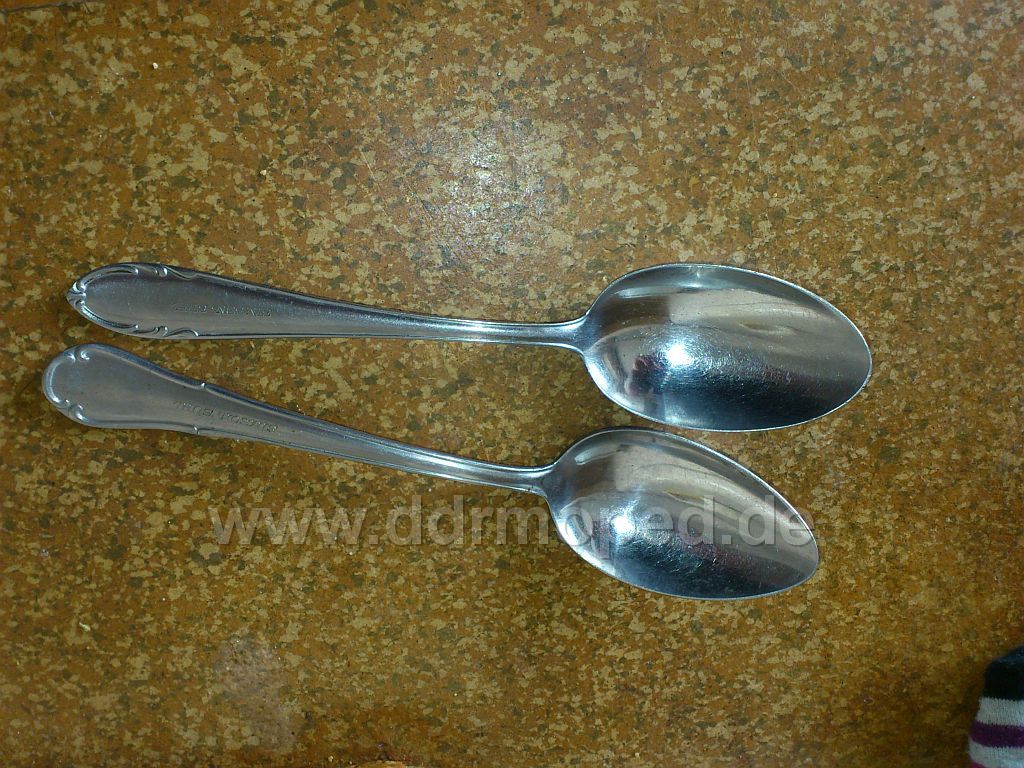 Es geht weiter, offenbar hat man auf Grund von "Abwanderung" das Besteck immer wieder neu aufgelegt. Ich hab nun zwei verschiedene Löffel. Das schöne ist an ABS, da sie immer wieder ein anderes Design hatten und man an ihm, das Baujahr nachvollziehen kann. Die Kantine hat also mehrfach Besteck bekommen, bis jetzt kenne ich drei Versionen. Mal sehen ob ich irgendwann mal ein dreiteiliges Finde. Wenn ich Messer, Gabel, und Löffel hab von denen, ess ich von nichts anderem mehr .