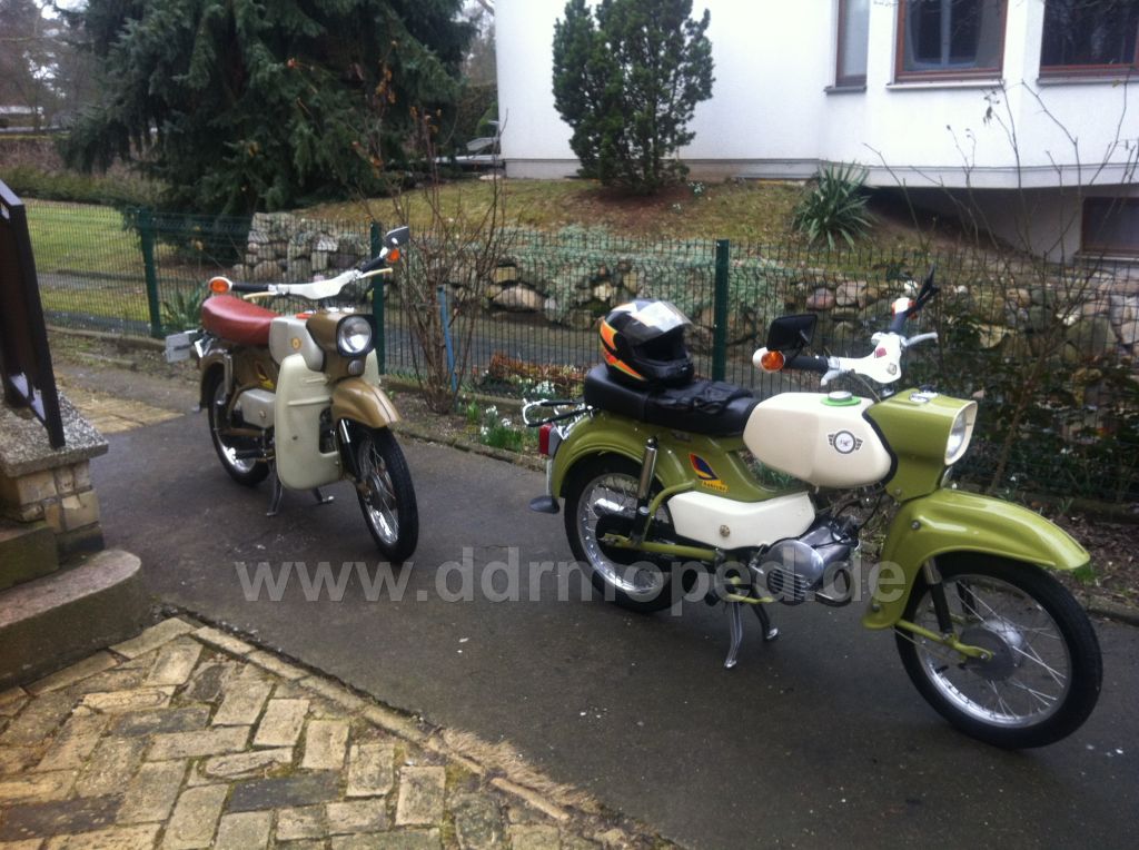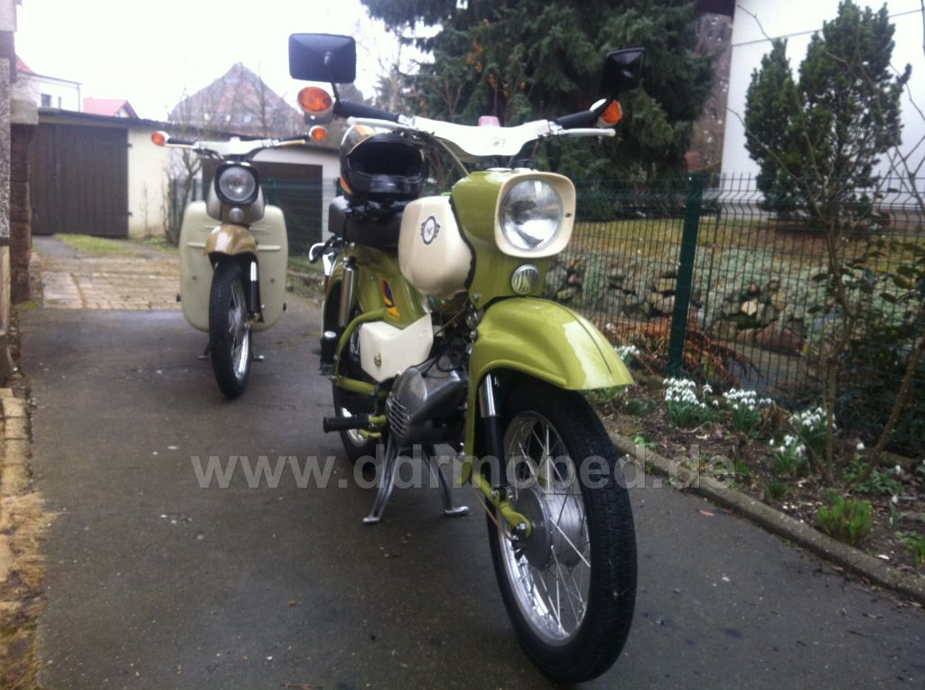 Meiner ist jetzt fast fertig, allerdings nur fast: Im Sommer ist geplant noch originale graue Bowdenzüge anzubringen (schon organisiert) sowie ein paar Schrauben die leider noch mit Silberspray "behandelt" worden durch originale zu ersetzen. Vielleicht kommt irgendwann auch mal noch ein originaler Auspuff dran, mein jetziger ist leider von MZA. Aber wenn nur als Schnäppchen, da ich keine 150 Euro oder was das jetzt kostet für ein Neuteil bereit bin auszugeben. Außerdem hat mein Bleisammler letztens irgendwie "gespuckt" sodass die Batteriesäure den Chrom angeätzt hat. Also kommt auch noch ein Gelakku ran.