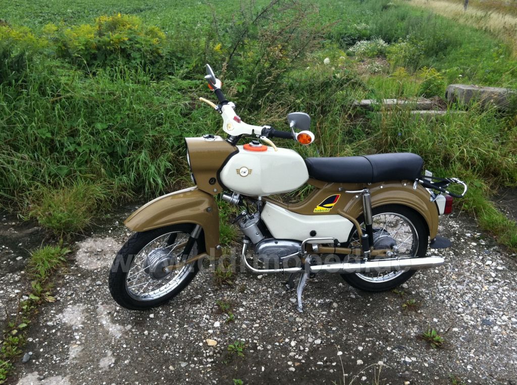 Mit dem Sitzbankbezug habe ich ja hier ein Thema angesprochen, dass schon vielen scheinbar auch Sorgen bereitet hat. Ich würde vielleicht dennoch lieber auf die Suche nach einem sehr gut erhaltenen DDR-Bezug gehen, als mir etwas neu drucken zu lassen. Anbei noch mal ein Foto vom Habicht auf Tour, da er technisch jetzt fit ist, nicht Öl mehr leckt und nebenbei noch einige neue Originalteile bekommen hat. Dem Ideal eines Original-Habichts kann er damit sicher nicht entsprechen, aber er sieht zumindest sehr danach aus. Und mal ehrlich, die vielen Leute, die mich bisher darauf auf offener Straße oder im laufenden Verkehr darauf positiv angesprochen haben, haben die kleinen Details wie Sitzbankbezug, Farbe der Bowdenzüge und Griffarmatur z.B. nicht bemerkt. Das wissen sogar, wie ich gemerkt habe, sogar ehemalige Habicht-Besitzer nicht, sondern evt. nur eingefleischte Fans hier im Forum :-) Dennoch, wenn ihr noch Tipps habt zum original machen, bitte legt los!  EDIT Muss bestimmt mal noch mehr Fotos reinstellen, kann ja sicher auch ein geübtes Adler...ähm Habicht-Auge nicht gut erkennen, was nicht geht