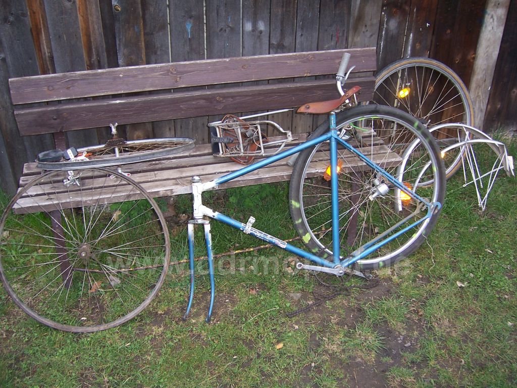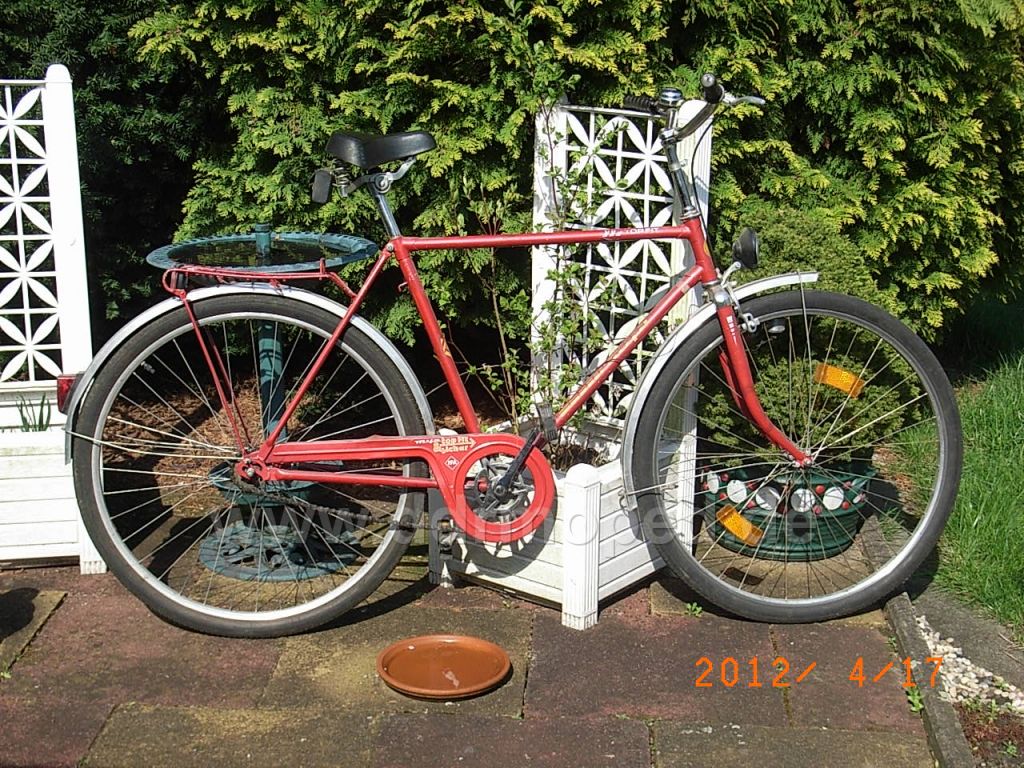 Hab heute einem Kollegen ein Fahrrad aus der Hand gerissen ,als er es in den Schrottcontainer werfen wollte. Es war dafür , finde ich , zu schade. Und da ich kein Fahrrad besitze,hab ich mich entschieden es ihm wegzunehmen. Da isses, zwar keine Schönheit aber es fährt. Ist wohl neueren Datums und nicht so schön wie eure Räder. Ich stell mal einige Bilder rein, vielleicht kann mir ja jemand dazu etwas sagen.