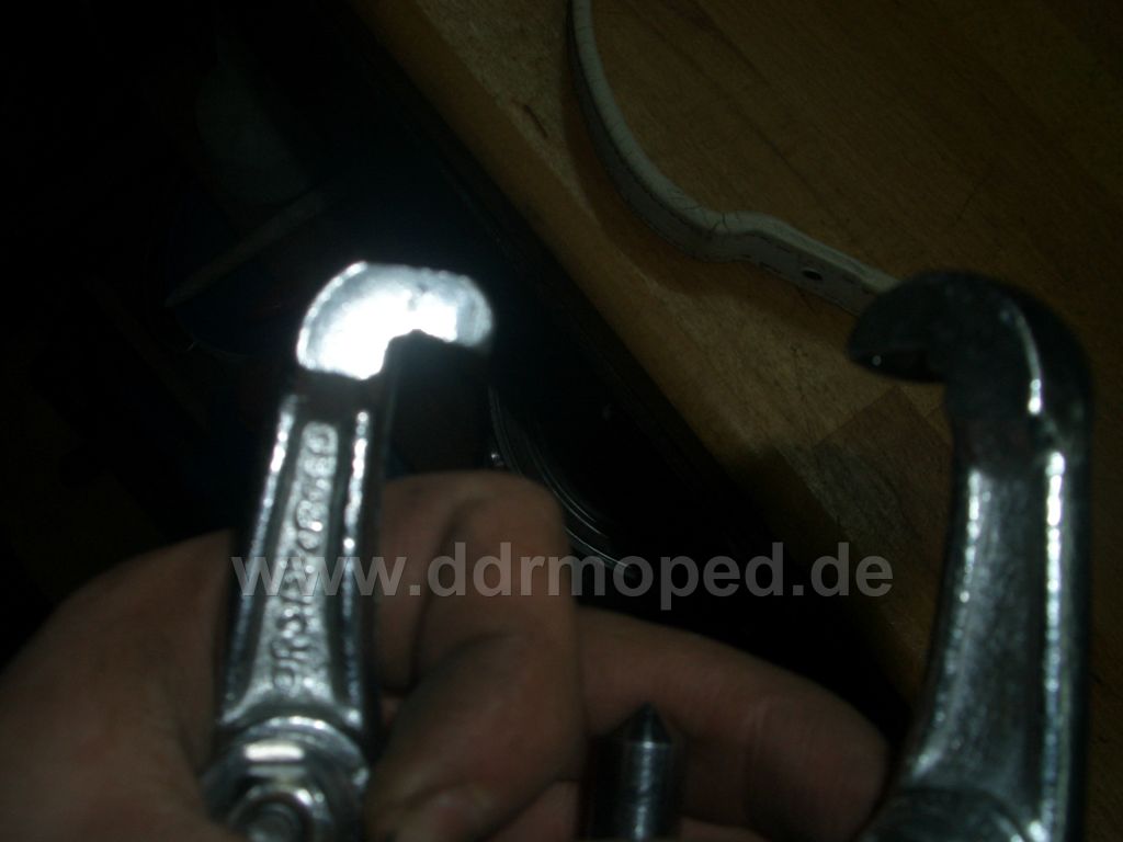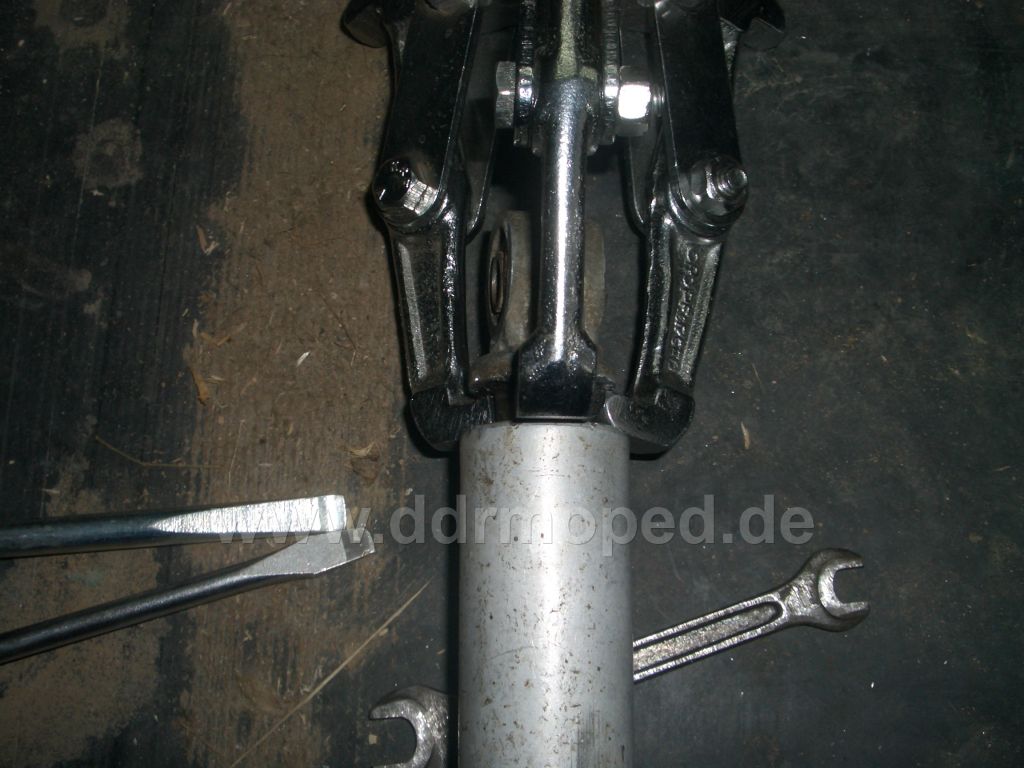 |  Der Abzieher ist mir auch ein Rätsel... Kerbstift raus und die Aluaufnahme ordentlich in WD40 einweichen. Dann die geschraubte Aufnahme in den Schraubstock einspannen und durch die untere eine Stange oder Schraubenzieher stecken und dran ziehen. Das muss gehen.Ansonsten wirklich mal mit etwas Wärme das Alu aufheizen. Also eigentlich so, wie Thorsten sagt.    Bisher gute Arbeit! mfg Toni