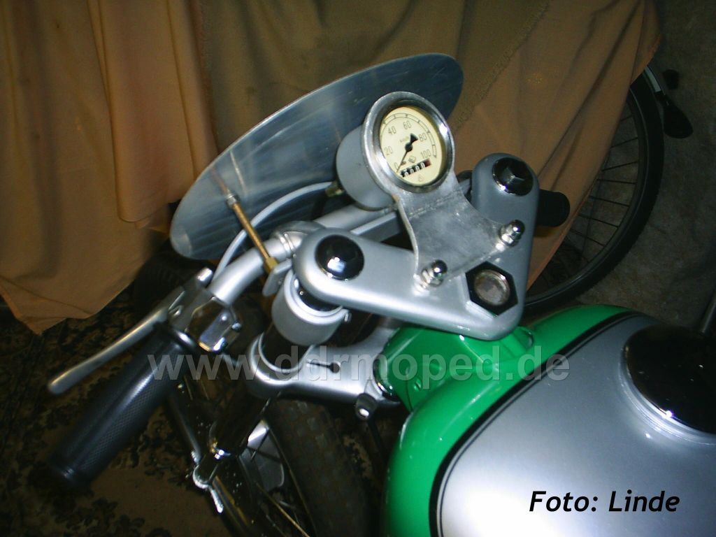 Der Lenker ist eine Nachfertigung, wovon ich mal mehrere gemacht habe, nahtlos gezogenes Rohr 22 x 1,5, bissel besseres Material. Mal sehen, ob ich noch Rohr da habe, dann könnte ich nochmal ...  ich müßte nur den genauen Winkel wissen, den du haben willst. Die Lenkerklemmen sind original von DKW und waren schon dran ...nur eben der Lenker war Schrott. Auf dem Foto ist noch die Probevariante zu sehen, der originale RT-Tacho ist jetzt durch einen Drehzahlmesser erstzt worden, da an Bergrennmaschinen kein Tachometer installiert sein darf.