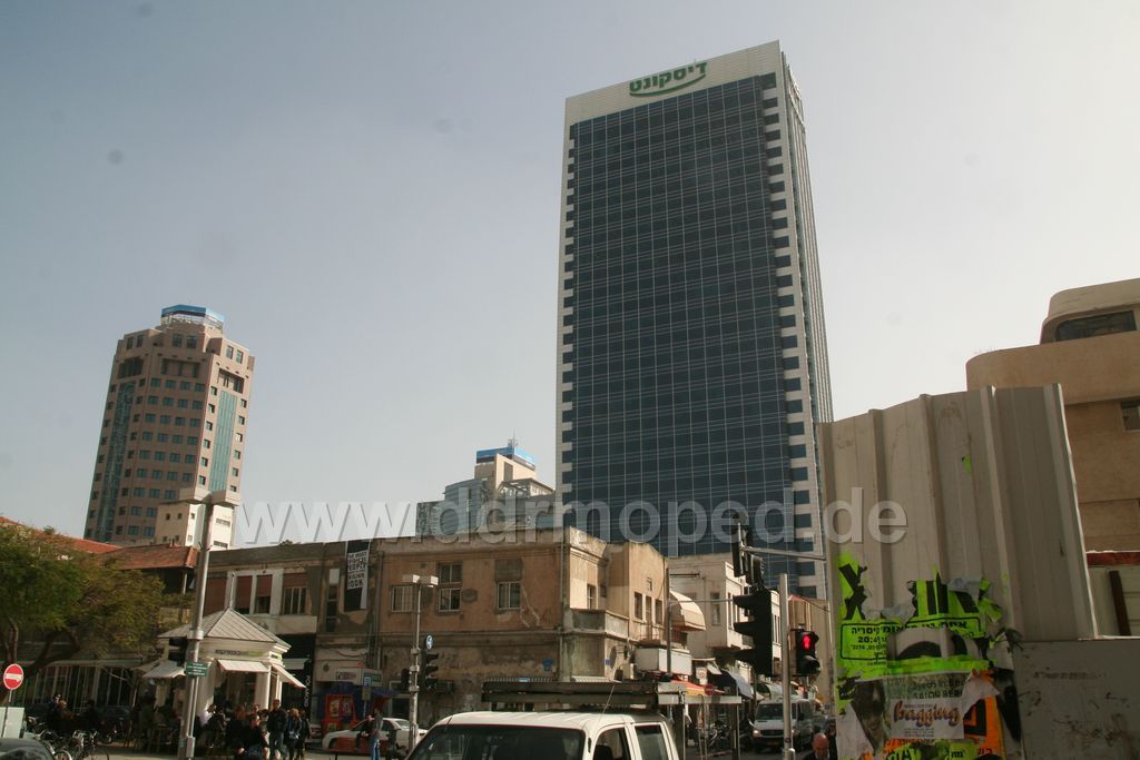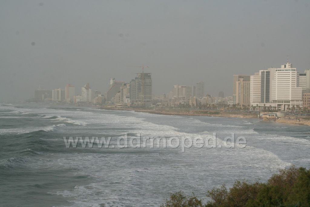 Diese Verbindung Tel Aviv-Yafo ist recht intressant. In jeder Beziehung. Tel Aviv ist eine grosse, sehr moderne Stadt mit Bankenhochhäusern und allen Botschaften (obwohl ja Jerusalem die Hauptstadt ist!) Man findet architektonisch eigentlich Alles, was es an Baustilen so gibt. Deutsche Kolonialzeit und Bauhaus inbegriffen. Wenn man in Tel Aviv bissel hochkuckt, könnte man meinen, man wäre in Frankfurt/Main. Hier der Blick von Yafo auf die Skyline von Tel Aviv.