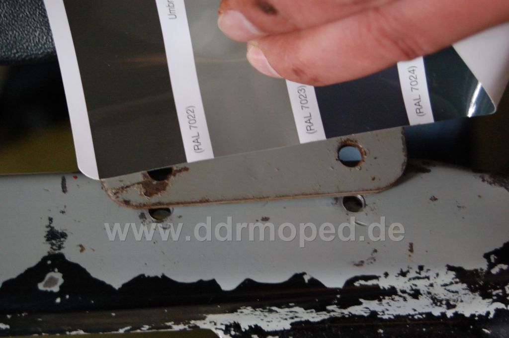 Nils, das ist das Blöde an den Fotos, weil die immer anders rüberkommen.... wer von Euch hat denn mehrere Schwalben mit orig. Rahmen ?? Wäre mal interessant, die mit einer RAL Karte (nur als Anhaltspunkt) zu bestimmen... Doc  und das Sitzbankblech hat auch mehrere unterschiedliche Farben ??