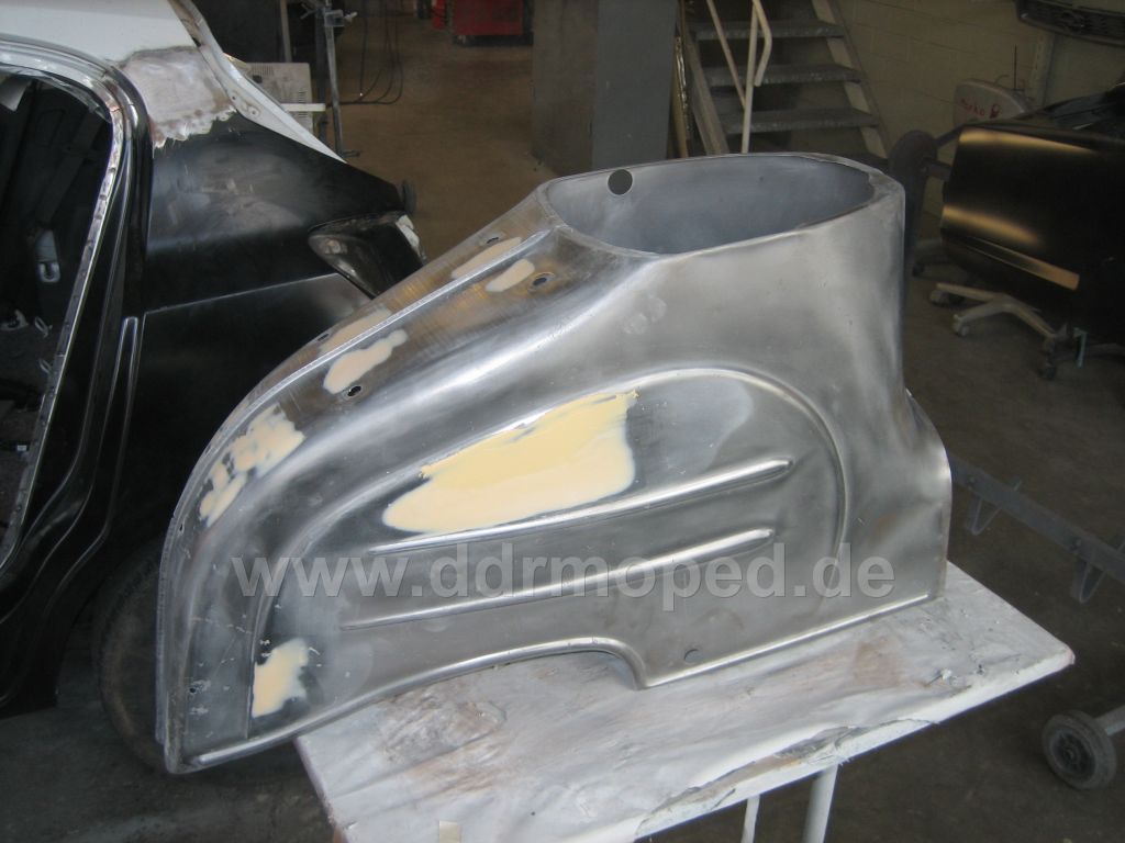 Die Gabel samt Kotflügel ist schon verbaut, der Motor ist auch so gut wie fertig (Bilder folgen) eine Felge samt Nabe ist fertig poliert, bei der anderen bin ich gerade dabei und die großen Blechtteile sind auch bald fertig zum lackieren.